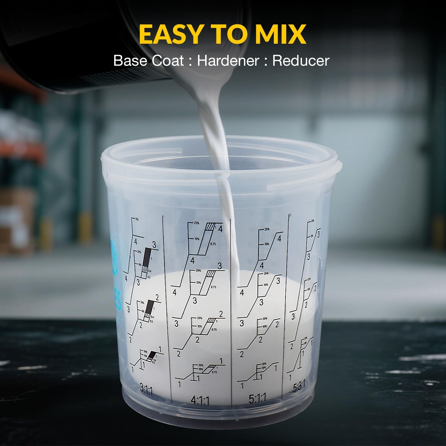 - Mix, Spray, And Store-All In One: The disposable spray gun cups streamlines mixing, spraying, refilling, and storing. Featuring measuring lines for easy mixing directly in the cup. No cleaning needed - just replace the liner. Seal unused paint with the cup plug for future use. Save on paint, cleaning solvents, labor, and time costs with this convenient system.