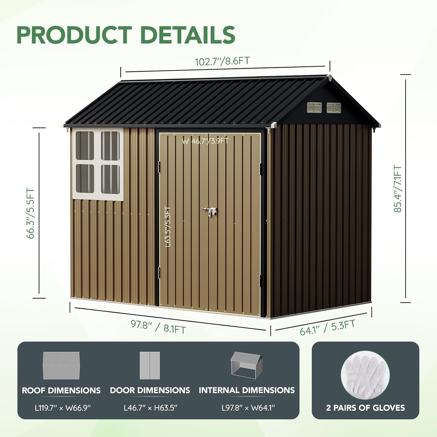 8X6FT Outdoor Steel Storage Shed with Lockable Doors, One Window,Ideal for Garden, Backyard, Patio Storage,Brown
