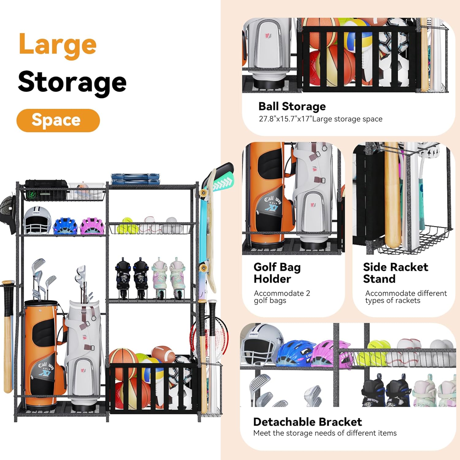 - ๐๐ฎ๐ฅ๐ญ๐ข๐๐ฎ๐ง๐๐ญ๐ข๐จ๐ง๐๐ฅ ๐๐ฉ๐จ๐ซ๐ญ๐ฌ ๐๐ช๐ฎ๐ข๐ฉ๐ฆ๐๐ง๐ญ ๐๐ซ๐ ๐๐ง๐ข๐ณ๐๐ซ: Equipped with storage baskets of different sizes, 2 golf storage racks, basketball storage boxes, racket racks, and 4 suspension brackets, it can meet your storage needs for different items