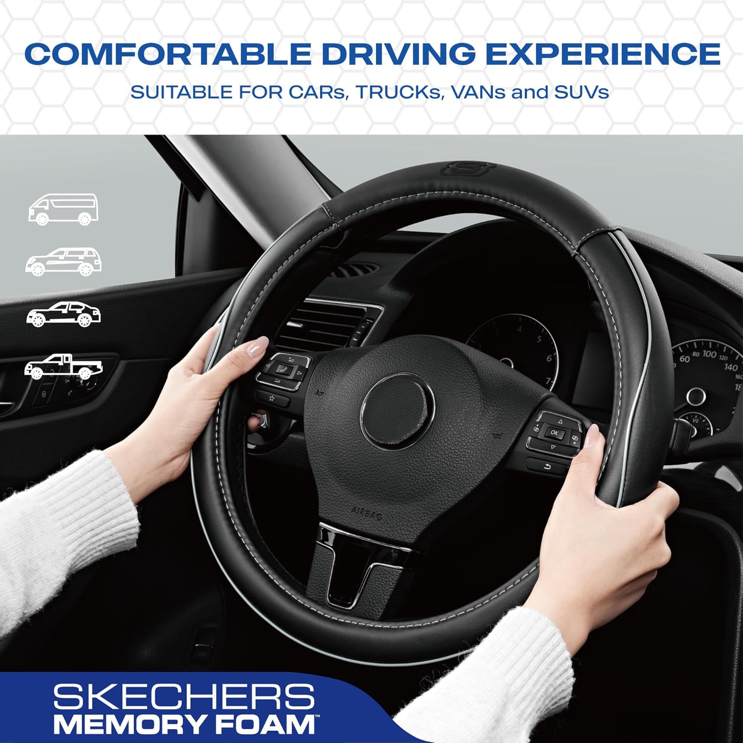 - SKECHERS MEMORY FOAM(TM)-Skechers Memory Foam(TM) steering wheel cover made from the same slow-rebound material as Skechers athletic shoes, high-quality leather that promotes airflow and reduces heat buildup, ensuring a comfortable and refreshing ride even on hot days.