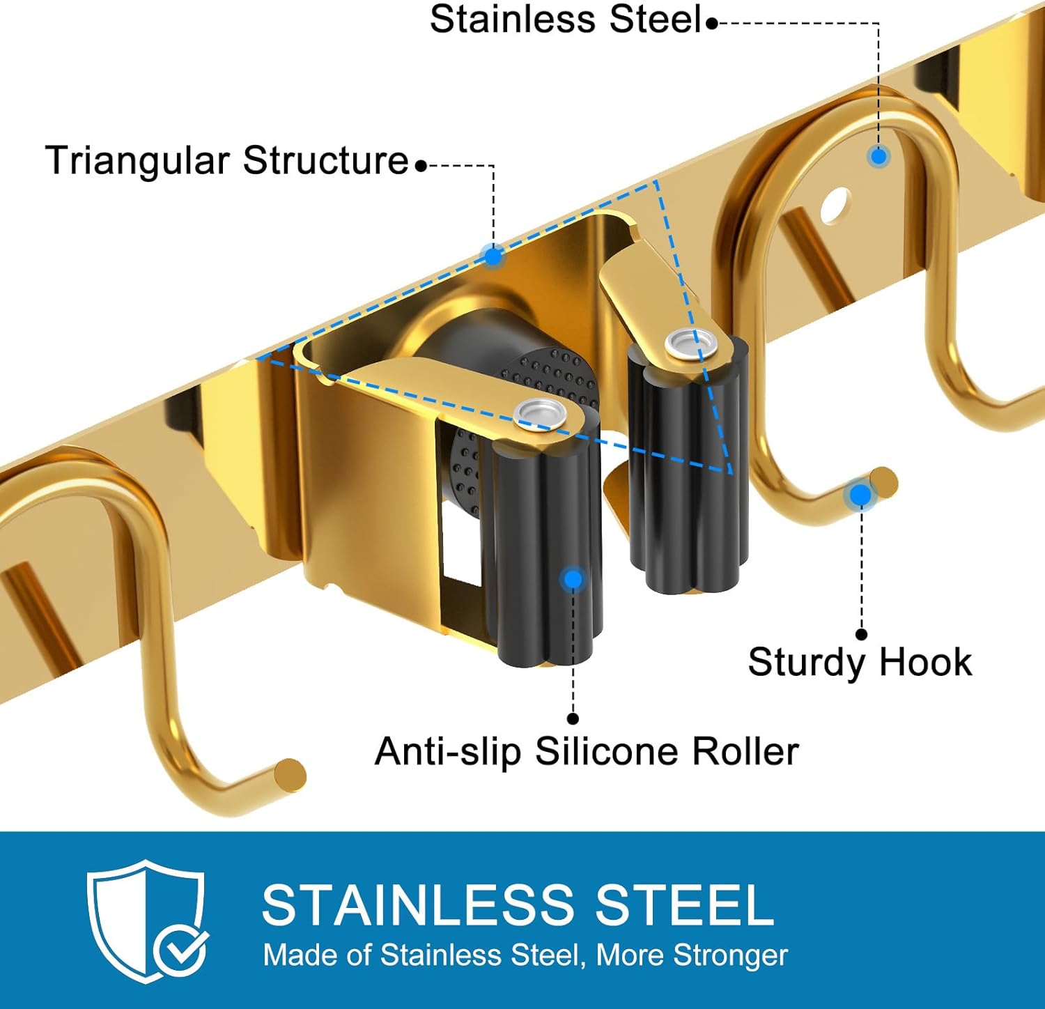 Mop Broom Holder Wall Mount, 2 Packs Gold Stainless Steel Tool Storage Organizer for Kitchen Garden Garage Laundry Room Bathroom and RV with 4 Slots 6 Hooks