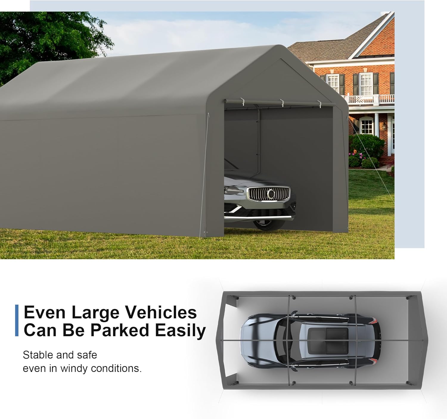 - 【Large Capacity Carport】The 10 x 20 FT canopy tent provides ample space for parking your car, truck, or boat. The triangular metal structure enhances the stability of the portable garage and comes with nylon ropes and ground nails to withstand strong winds.