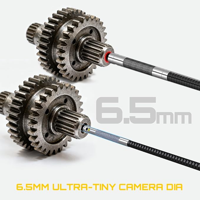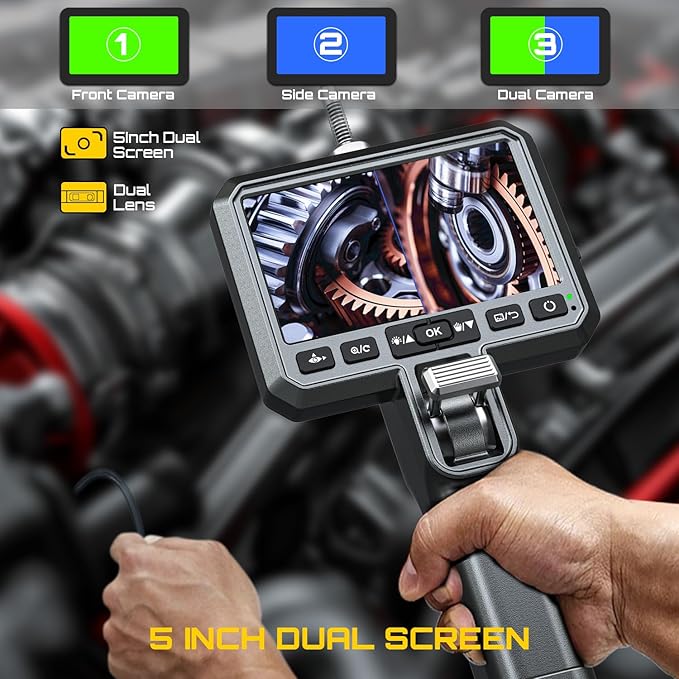 - 【6.5mm Ultra-Slim Dual-Cameras Probe】Why need dual cameras? 90 degree additional scope camera meets the requirement Especially inspection in most tiny and complex spaces and need to view other direction. One button switch to 90 degree side direction is very useful. 5" large HD Live Screen supports front camera, side camera and dual view three modes.