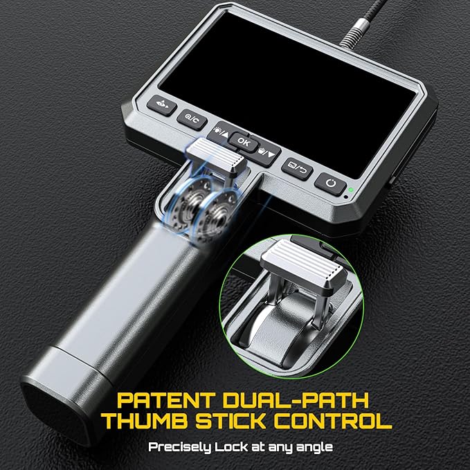 - 【Patent Dual-Path Thumb Stick Control】Precisely lock at any angle. The articulating borescope Dual-Path Thumb Stick mechanism is from aircraft’s flap control lever. The aluminum alloy dual-path steering control is more durable and stable, and has been patented.