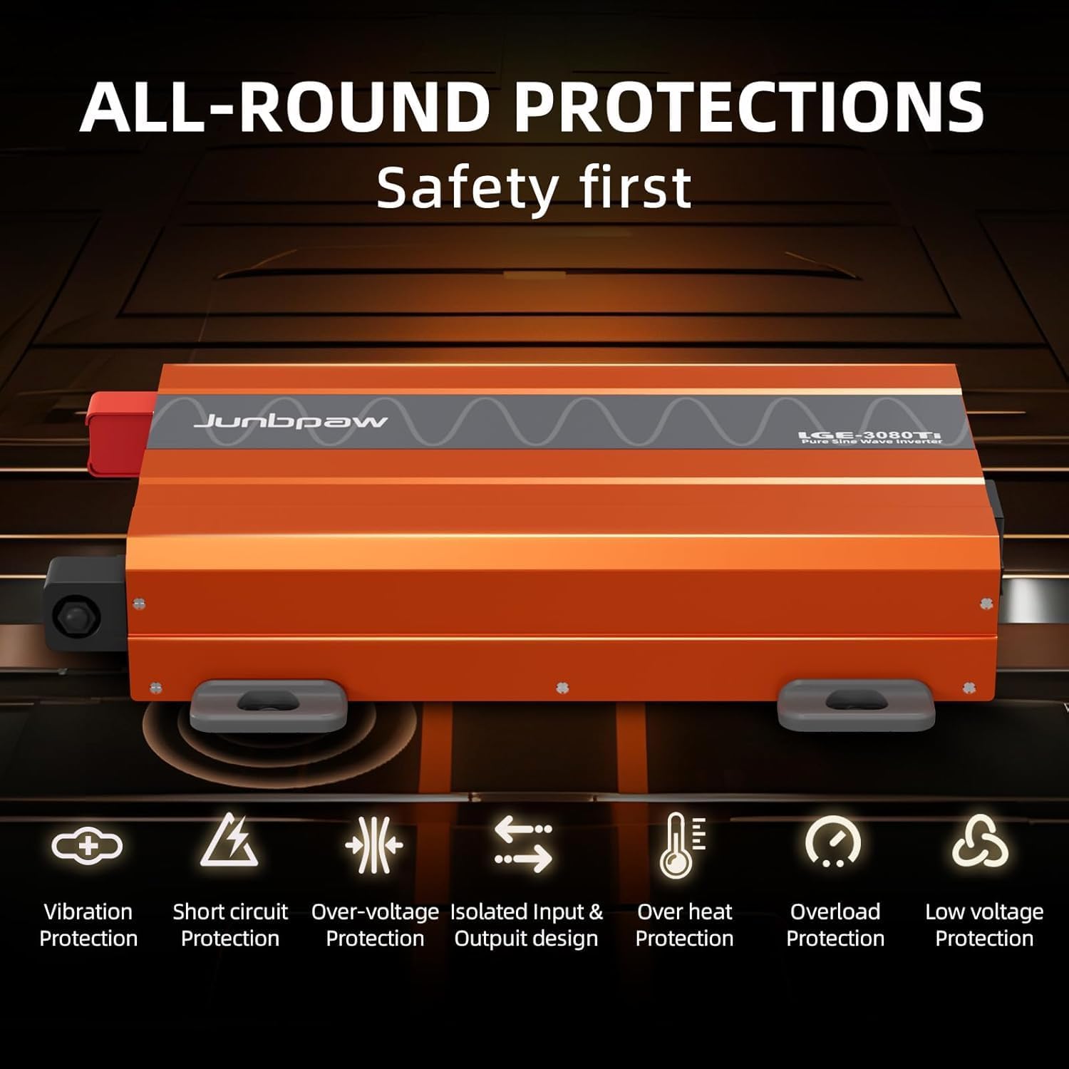 - 【Dual Ball-bearing Fans】The Junbpaw pure sine wave inverter built-in dual ball-bearing fans ensure quieter performance, an extended lifespan, and stable operation for over 50,000 hours.