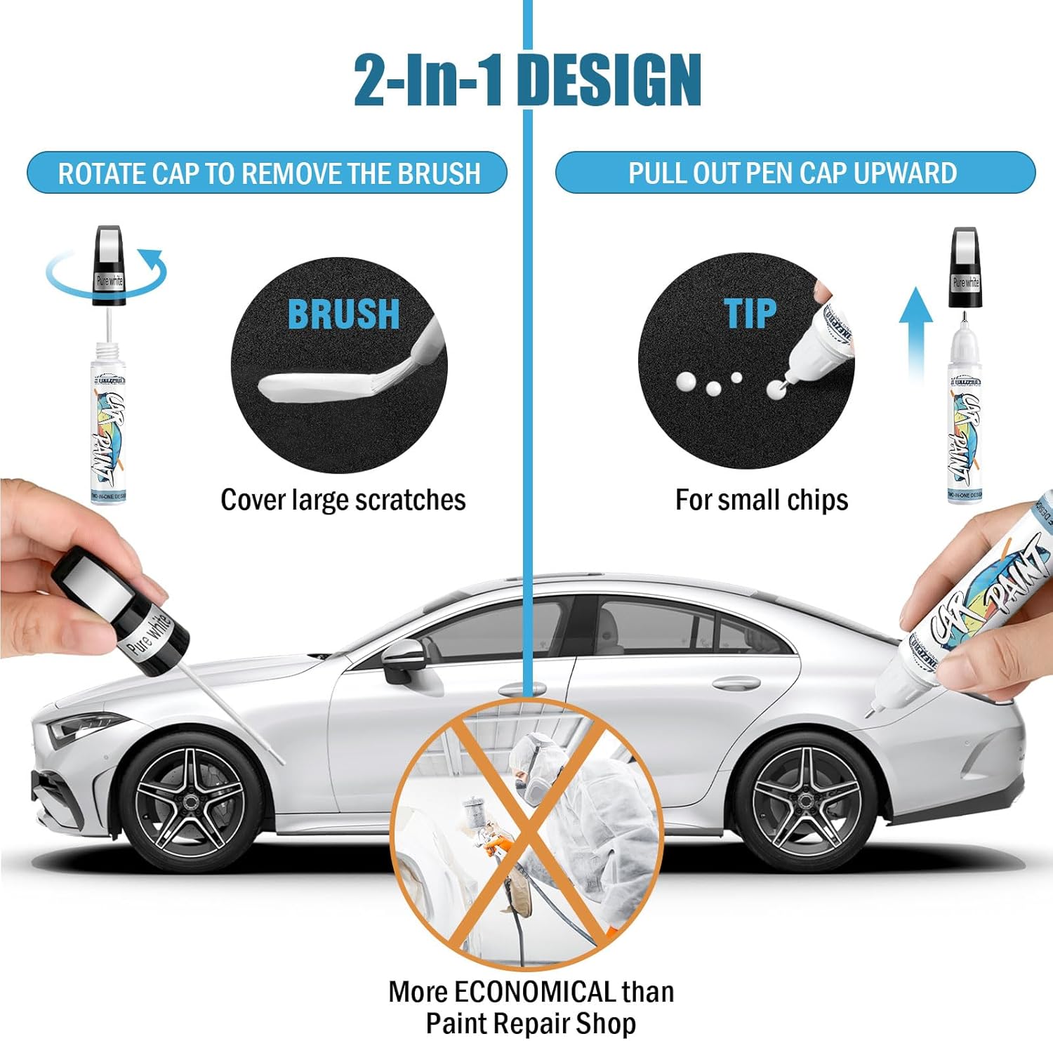 - Multiple Solutions: Our automotive paint pen has a multifunctional 2-in-1 design and upgraded brush, unlike traditional hard-to-control spray paint, our car scratch repair pen has a metal tip to fix small paint peel or chips. The brush to cover larger scratches, it can realize a precise and easy repair. Auto paint can also be used on a variety of other surfaces such as rims,bicycles,motorcycles,furniture,etc.White car paint can fix more situations than you can imagine