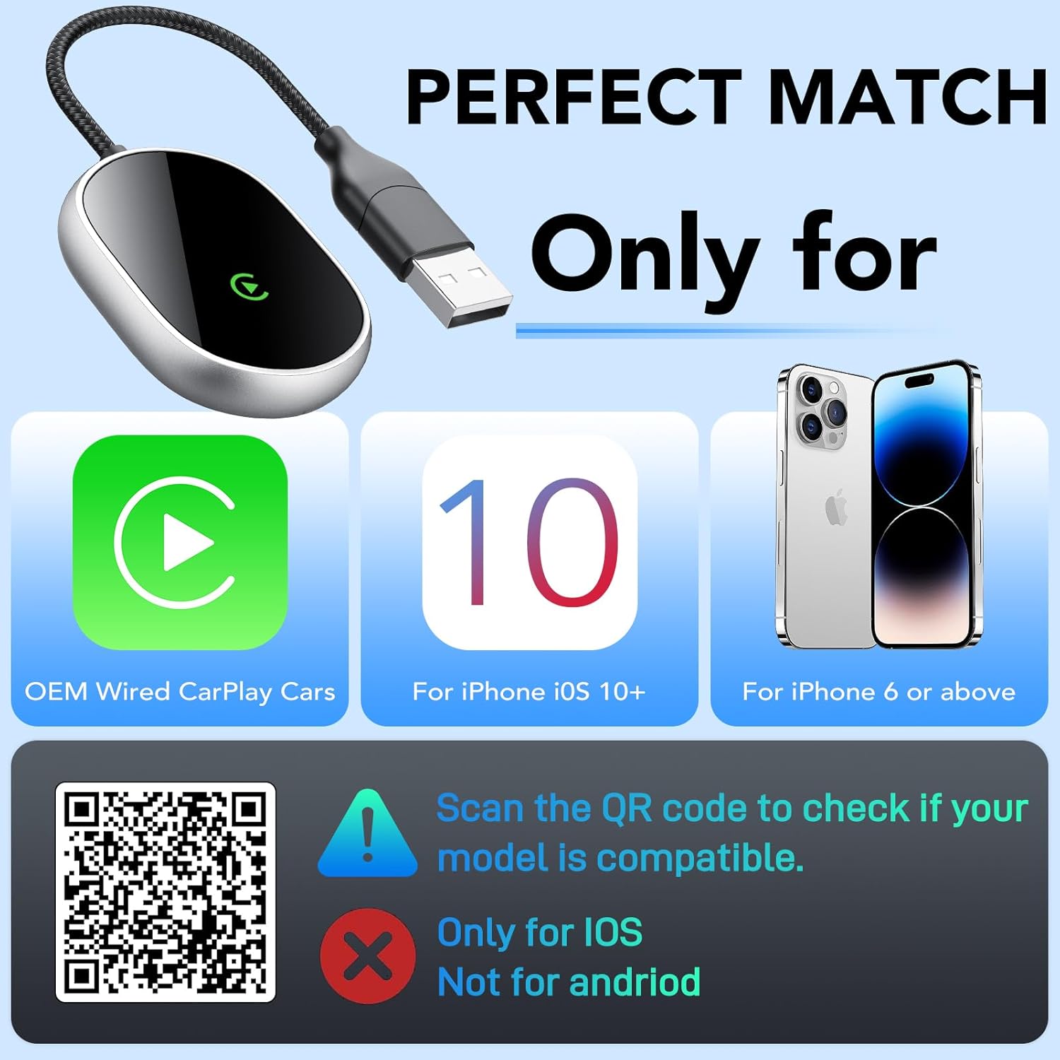 - 【Wireless Carplay Adapter】: Instantly transform your vehicle's wired CarPlay into a wireless system! Enjoy navigation, music, Siri, calls, and messages without the hassle of tangled cables. Maintain full CarPlay functionality and original car controls for a cleaner, more comfortable driving experience.