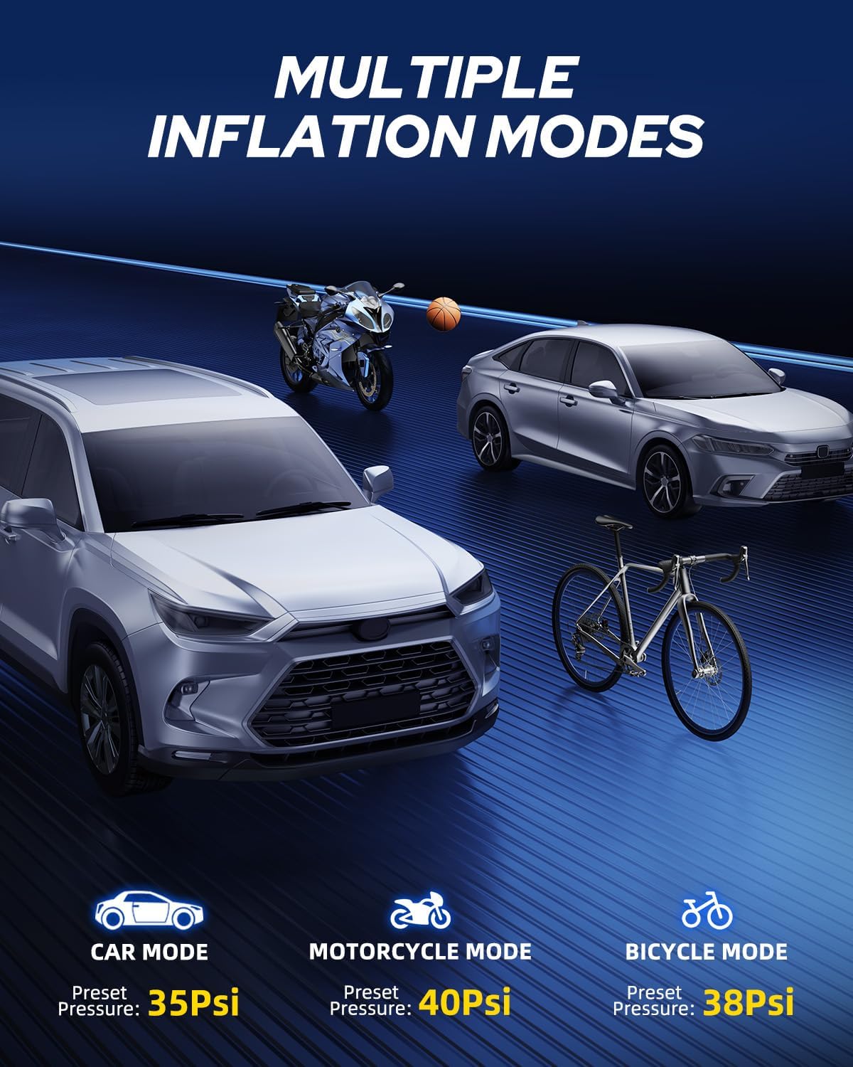 - Jet-inflate: AUTOONE Upgrade tire pump needs only 40s to refill a compact SUV tire ( from 29 to 36 PSI); Universal pressure of 2-150 PSI. Being faster and highly accurate, optimized for compact cars, motorcycles, SUVs, bicycles, balls, and other inflatables