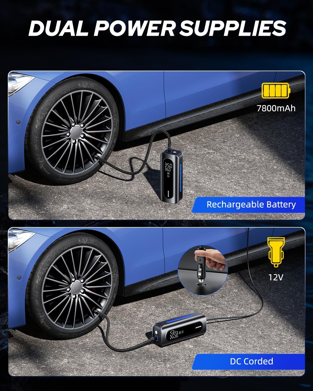 - Convenience to Inflate from Any Angle: Portable tire inflator built in 7800mAh powerful rechargeable battery with an 19.7 inch upgraded anti-scalding and high-pressure hose for cordless convenience. What’s more, 12V car power adapter is also available(11.5 FT long wire to cover whole car), providing uninterrupted inflation at any time