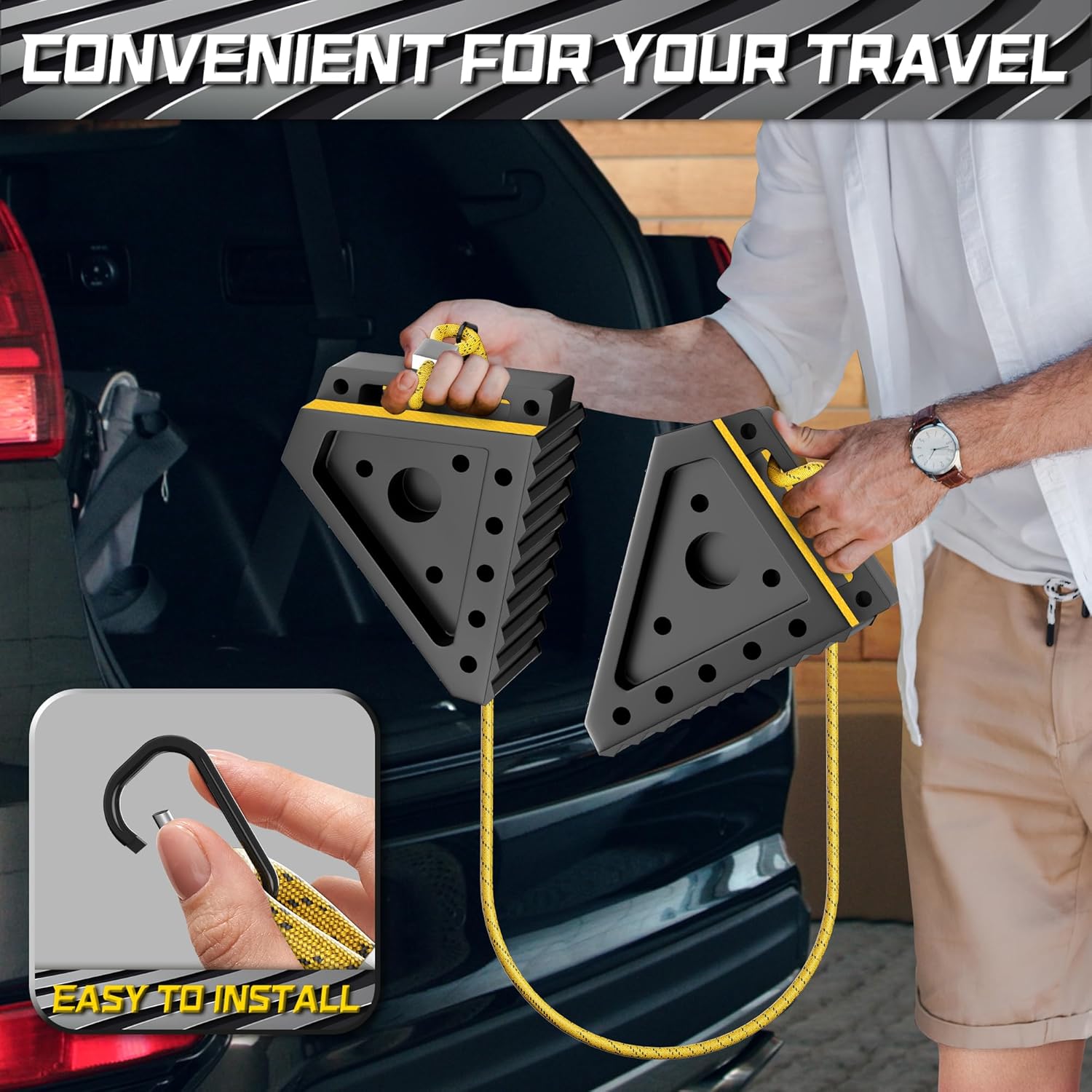 - EASY TO STORE WITH HANDLES AND 39 IN ROPE: The end of the rope is designed with a carabiner, which can be quickly installed, and we also added a handle to the wheel chock to make it easy to lift and carry when you use it.