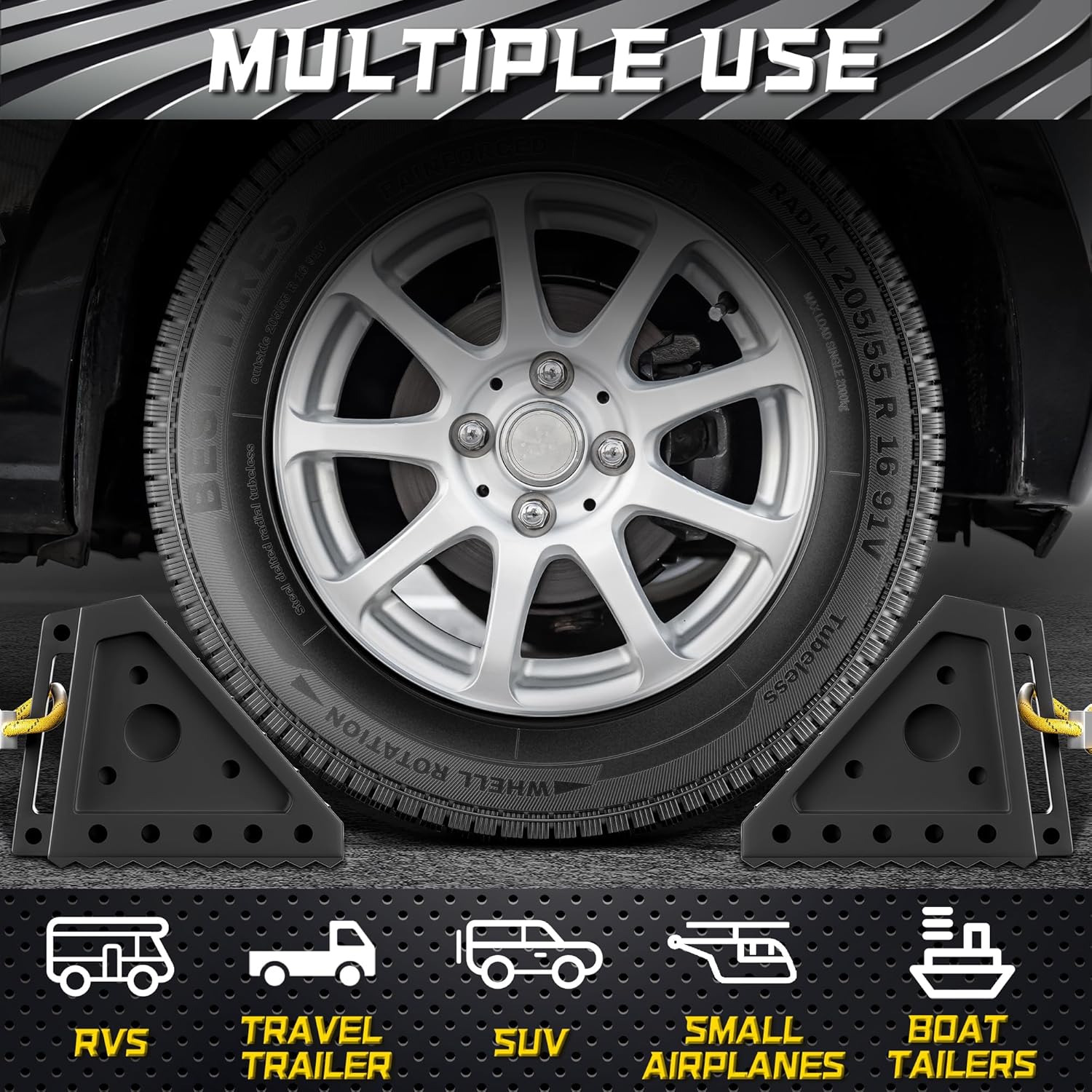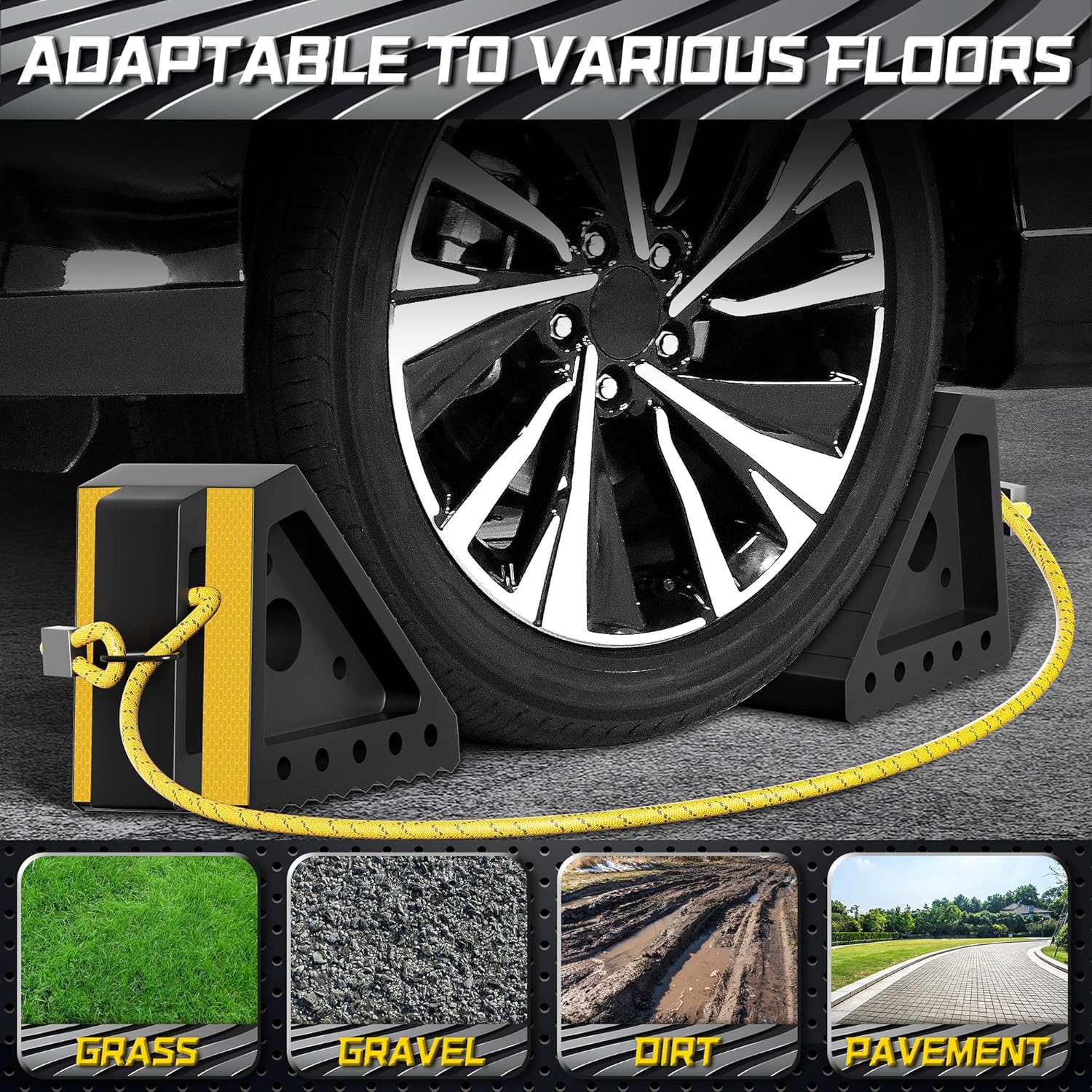 - WARNING REFLECTIVE STRIP: Each wheel chock is designed with two yellow reflective strips for increased visibility and provides the warning function when the vehicles are parked. It can effectively remind drivers to avoid collisions and keep your vehicle safe.