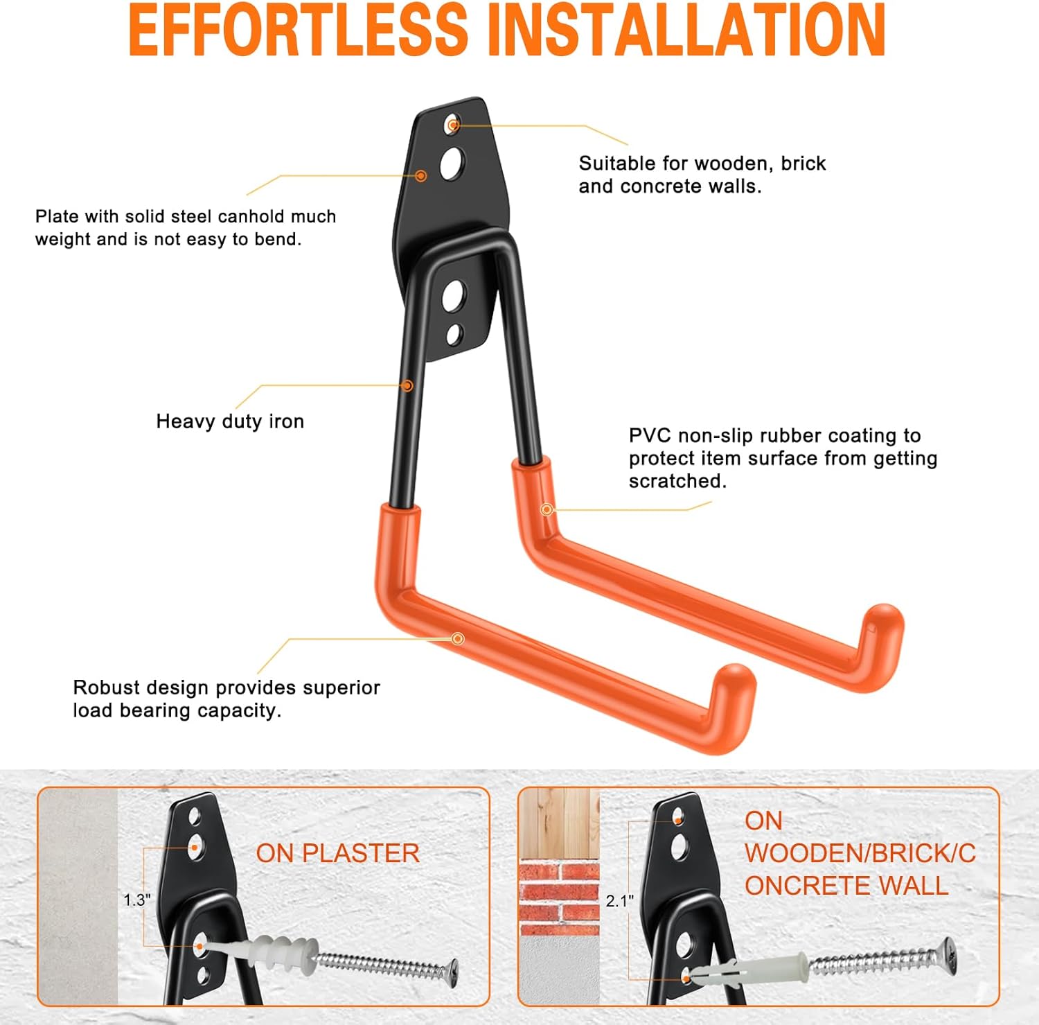 - Heavy-Duty Hooks: Ten 5.1 inch U shaped wall mounted garage hooks, The tubular double bar hooks design makes the garage utility storage hooks more stable than regular single tong hooks.