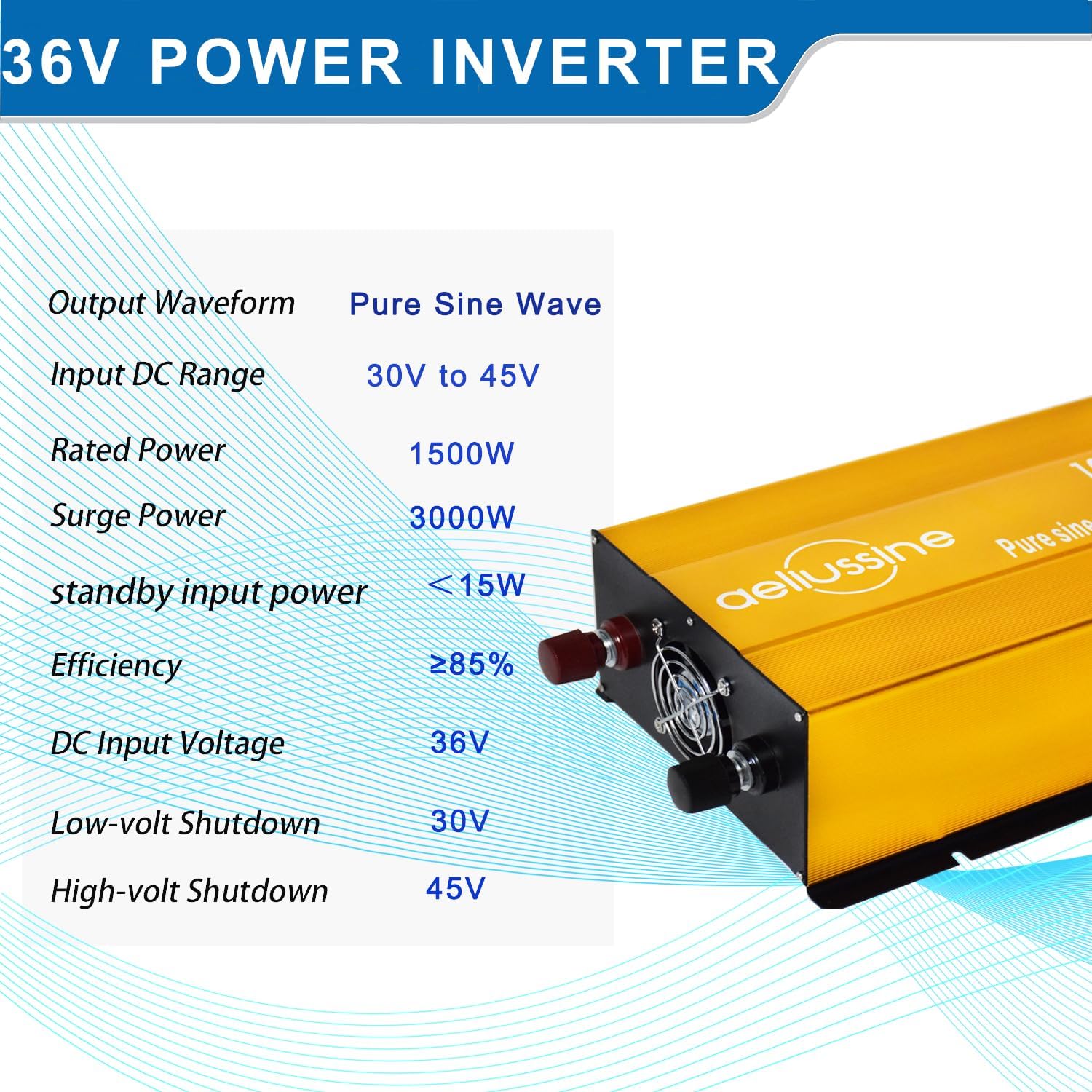 - 【pure sine wave inverter】Smooth and perfect sine waveform, just the same as home power/city power, Provide max 1500 watt continuous power and 3000 watt peak power at 60Hz frequency, power your 110v 120v ac appliance with a 36v power battery bank (battery voltage 30v to 48v is acceptable)