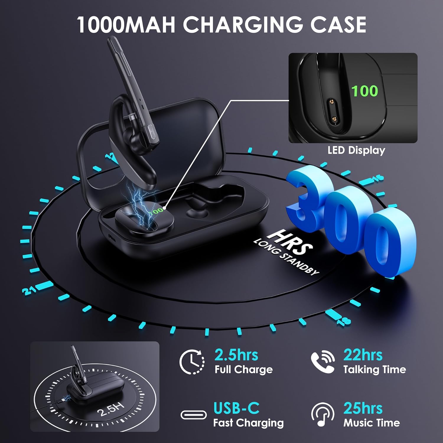 - Large battery capacity & LED Display Wireless Headphone battery capacity is 150mAh, single charge can last for 25 hours(50% volume), and it can be fully charged in 3H. Wireless earpiece comes with a 1000mAh charging case, it’s convenient for you to travel for a long time without frequently searching for a charging port. The charging box has LED digital display to show the battery life that more intuitively reminds you the remaining battery of the charging box.