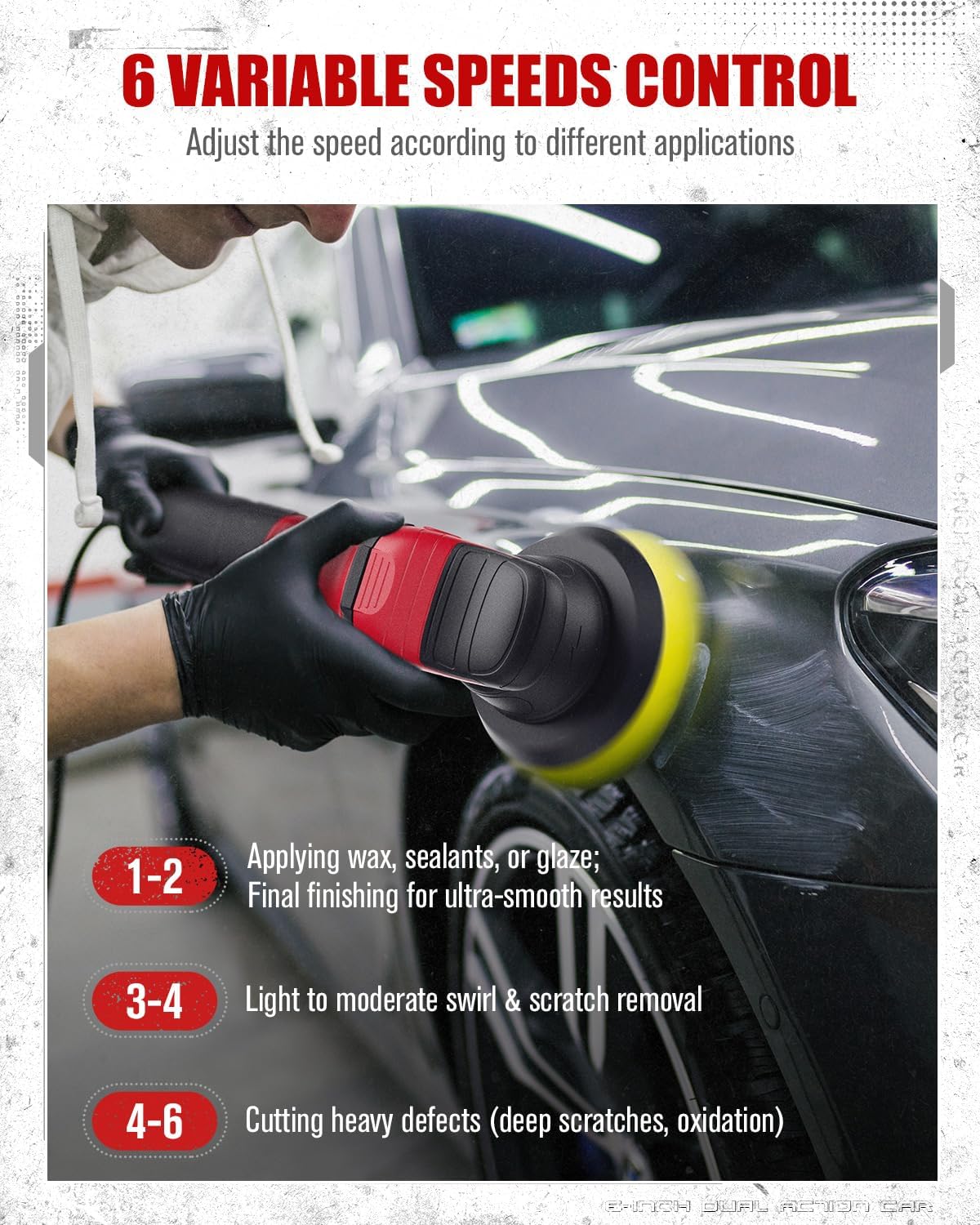- Variable Speed Control: 2000-6400 RPM range for precise waxing (low), polishing (medium), or paint correction (high)