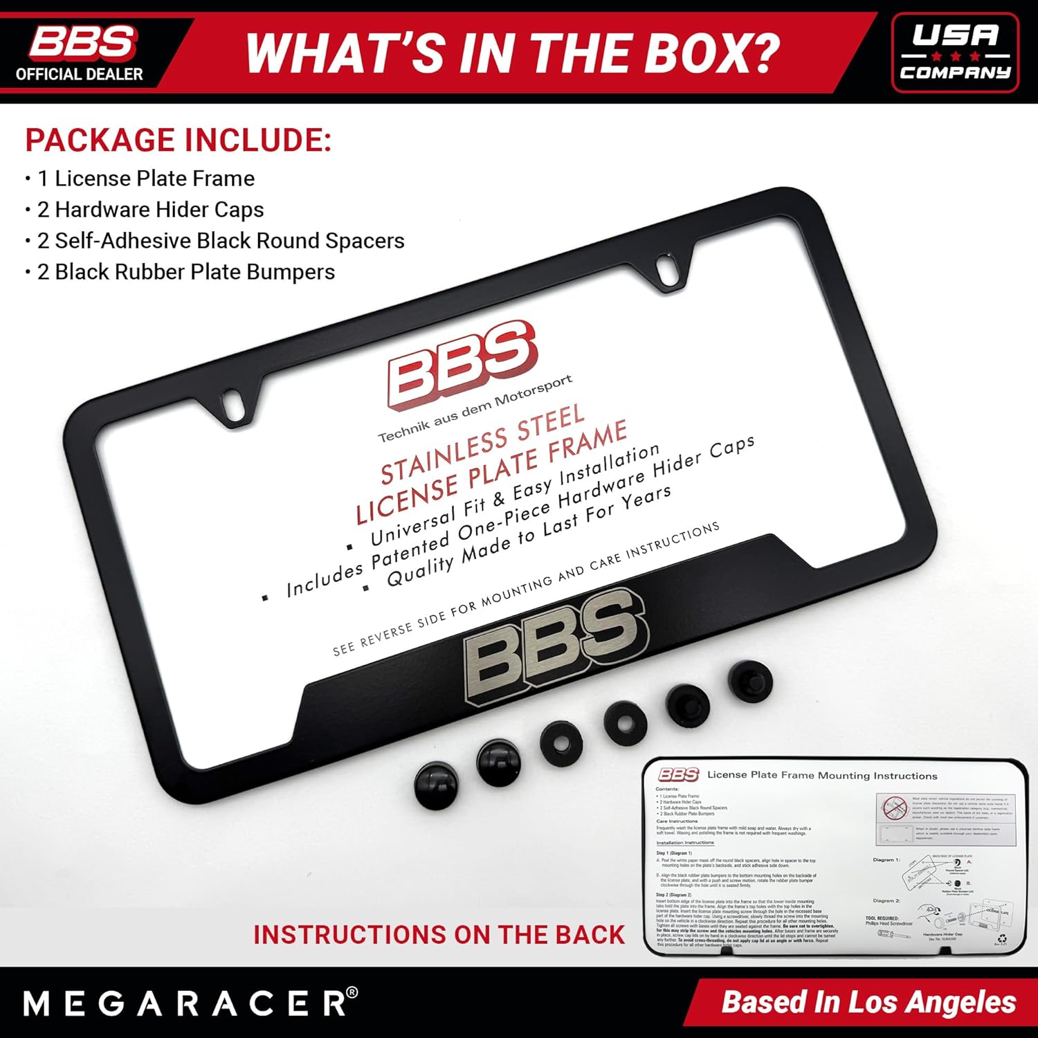 - MADE IN USA: 100% Genuine, Authentic BBS license plate frame holder in stainless steel matte black finish with BBS logo. It will not rust or corrode. Powder coated and USA made.