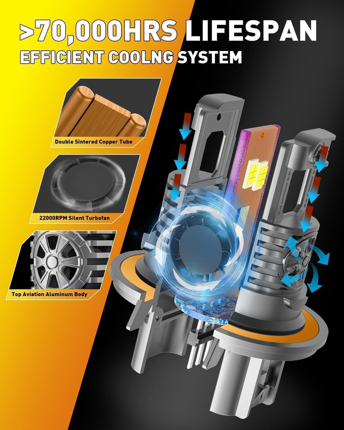 - Unrivaled Power and Performance: Crafted with precision from premium aviation-grade aluminum, complemented by a thermostatic copper plate and a high-speed 22,000RPM cooling fan, our H13 9008 driving lights feature an unparalleled cooling system. This ensures swift heat dissipation, maintaining stable and uninterrupted operation. With an extended average lifespan of 75,000 hours per light, you can count on reliable performance mile after mile