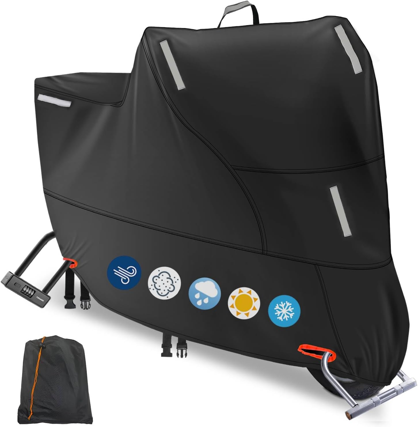 Motorbike Cover for Outside Storage, 300D Oxford Waterproof Motorcycle Scooter Moped Cover Outdoor with 5 Reflective Strips and 2 Windproof Buckles, 2 Lock-Holes and 1 Storage Bag (2XL: 94x35x49 inch)