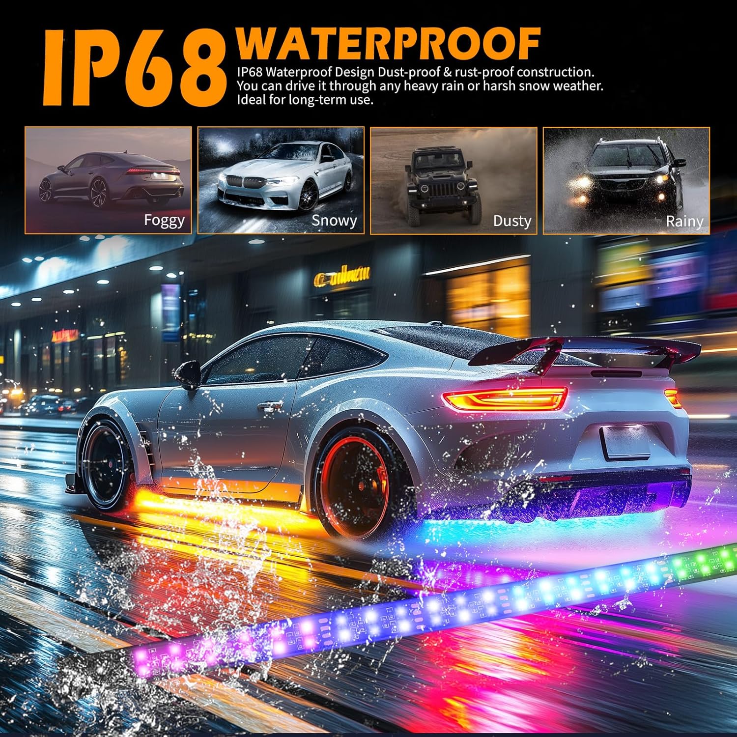 - 【IP 68 Waterproof & Strong adhesive】: Exterior car LED light strips made of Flexible Rubber Tubing IP68 waterproof material, completely sealed by transparent shell,protect the car underglow strip lights to work well on any weather condition. In addition, strong adhesive and cable ties ensure stable installation. Even driving through lots of rain, highway speeds, potholes, the LED strips can still stay on and work great.