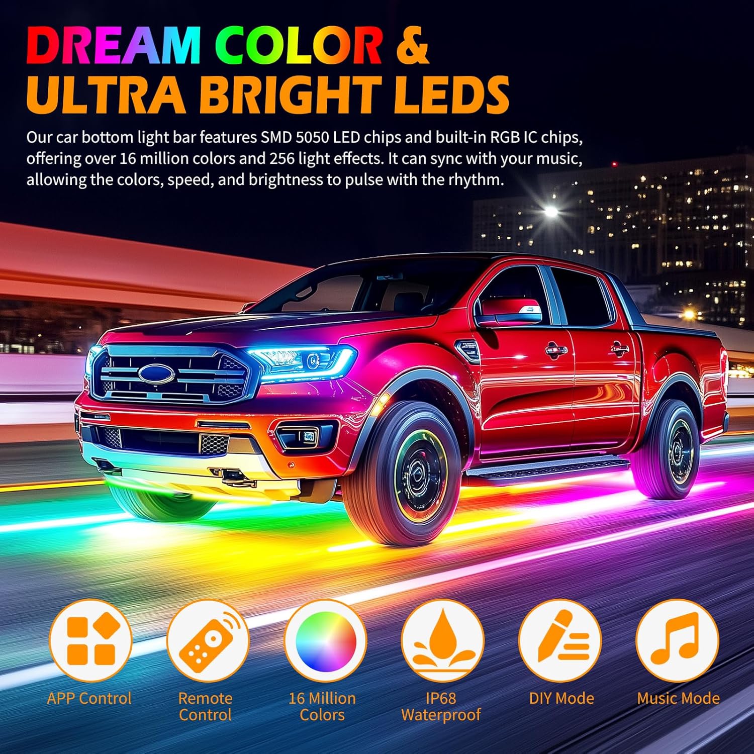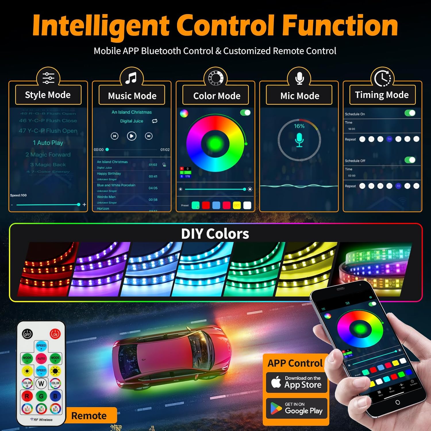 - 【Bluetooth & Remote Control】:The underglow kit for trucks with mobile Phone APP Control, phone control direct, control range up to 20 meters; The app control has 5 functional modes: Multi-color-DIY ; Music Mode; Rhythm; Function Mode Option; Timing Function.Car underglow light with over 16 million colors for you to enjoy and indulge, DIY lighting effects, Music sync, Multi-color Mode with adjustable brightness, such as Colorful gradient