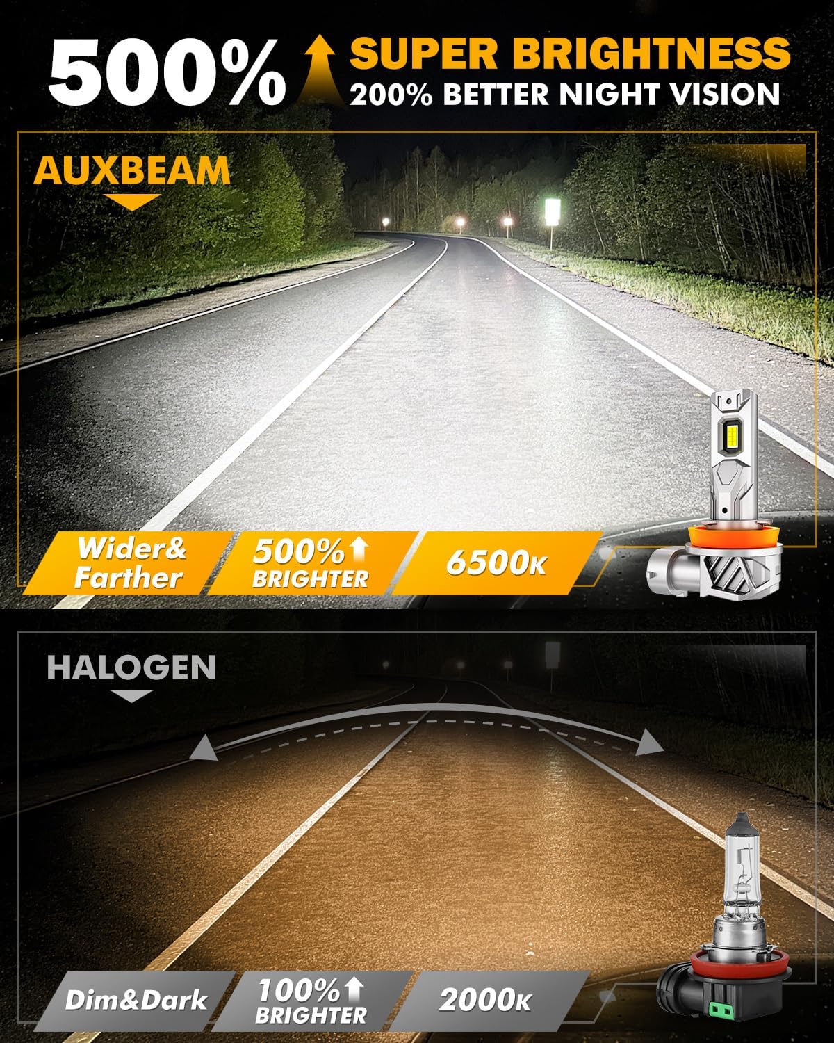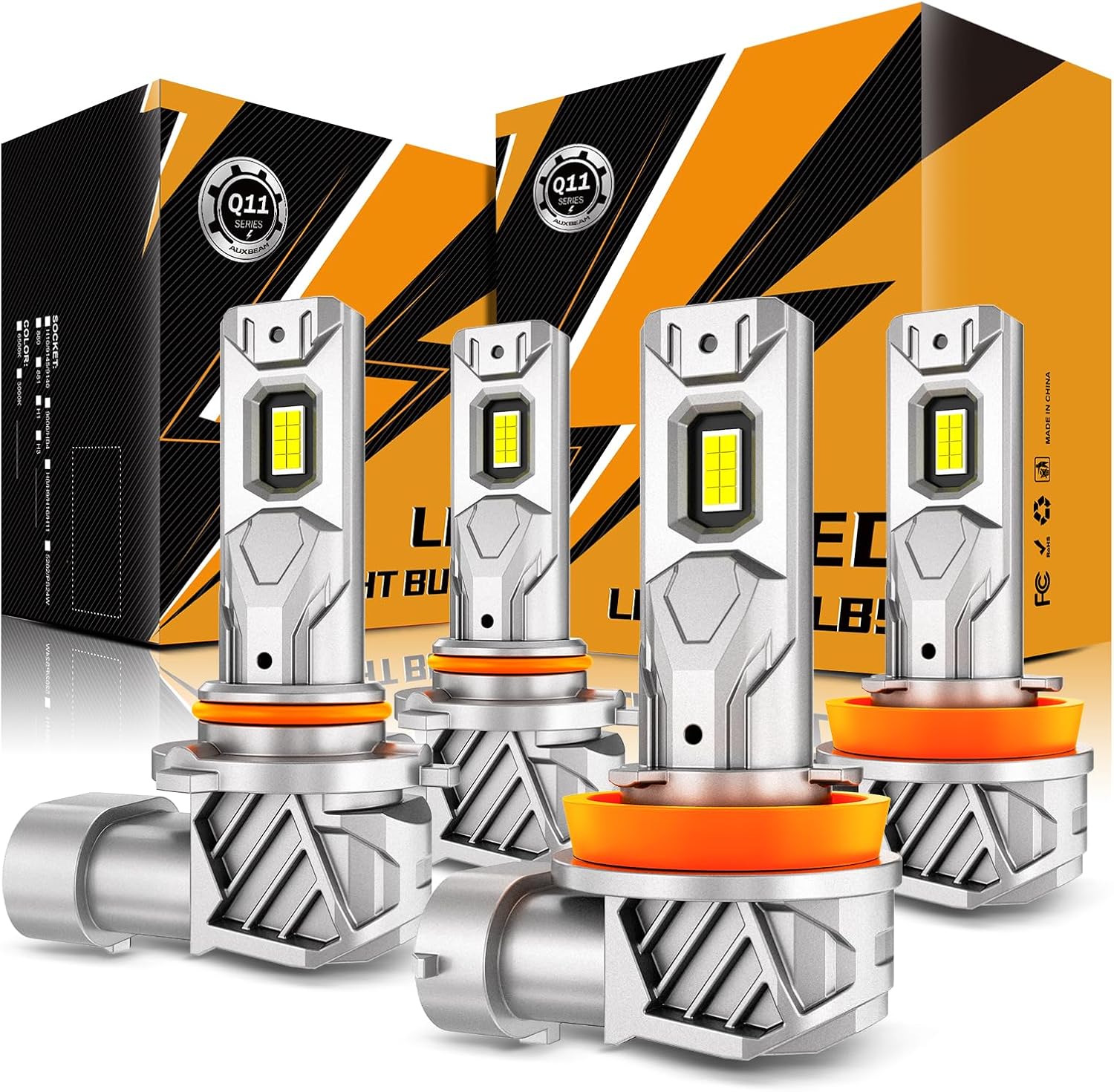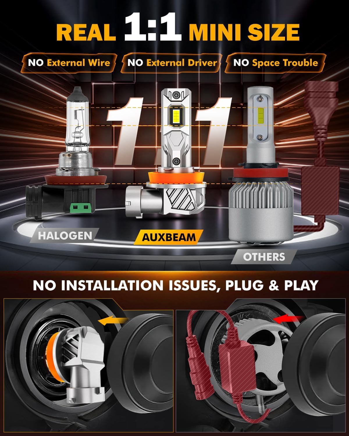 Auxbeam 9005 H11 Fog Light, Super Bright 1:1 Mini Size 6500K White, H8 H9 HB3 Fanless Replacement For Off-road Use Or Powersports, Plug and Play, Pack of 2
