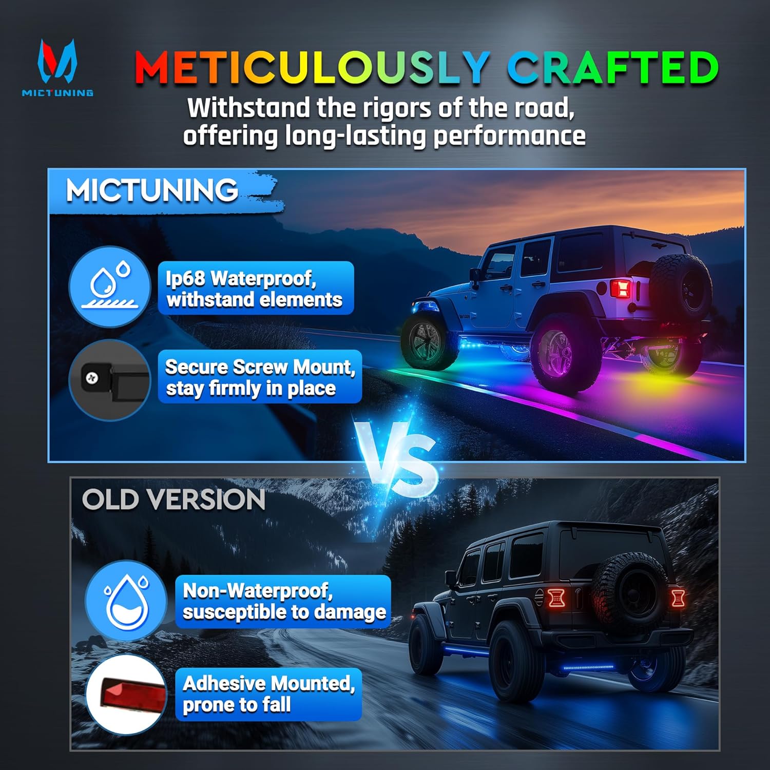 MICTUNING 8Pcs N8+ Chasing Color RGB+IC Underglow Neon Accent Strip Lights, 12V Multi DreamColor Music Soundsync Exterior Underbody Lights for Car, Wireless App & Remote Control, 2 Years Warranty