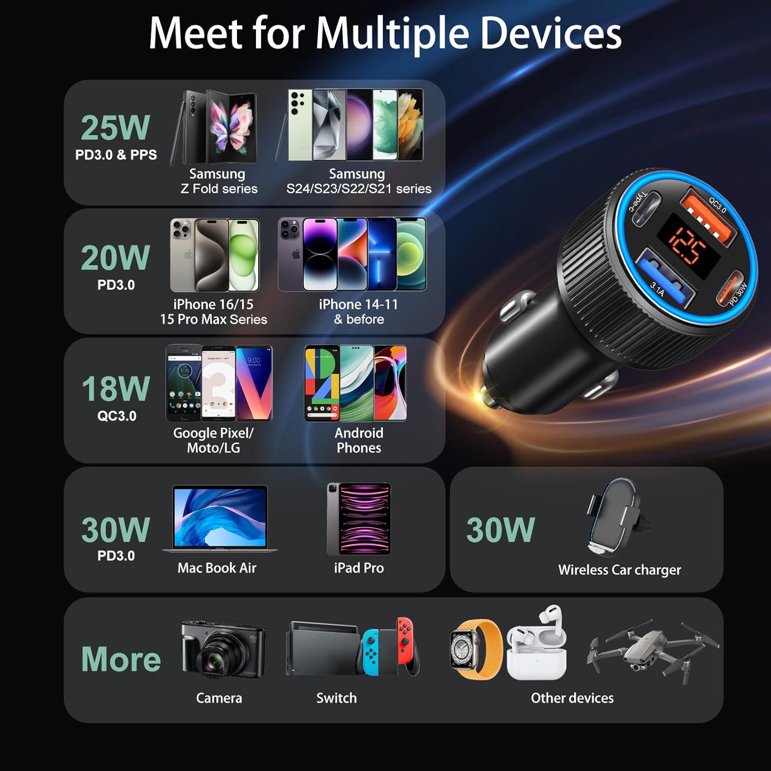 - [65W 4-Port Fast Car Charger] With the upgrade QC3.0+PD Fast charging technology, the 65 Watt car adapter can provide high power output of PD 30W and QC 18W simultaneously, fast charging for iPhone, Galaxy, tablets even Macbook and quick charge 3.0 for most android devices from 0% to 60% in 35 minutes.One car charger adapter with both standard usb and c type connectors, works with all types of charger cables.