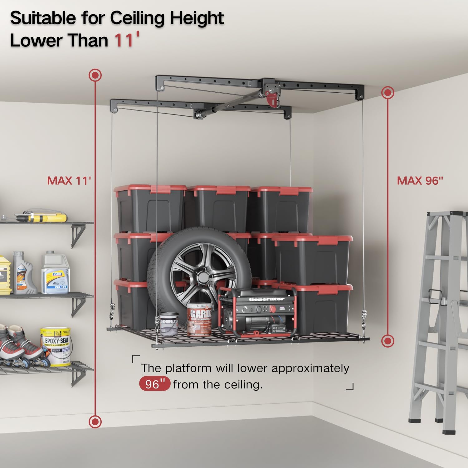 - Maximize Garage Storage Space & Height Compatibility: Get 16 sq feet of additional overhead storage space with our garage hanging storage rack. Suitable for ceilings up to 8-11 FT high, and the platform can be lowered approximately 96 inches (8 FT) from the ceiling, making it ideal for both low and high garage spaces. Perfect for those who need extra shelving but donβt have the floor space.
