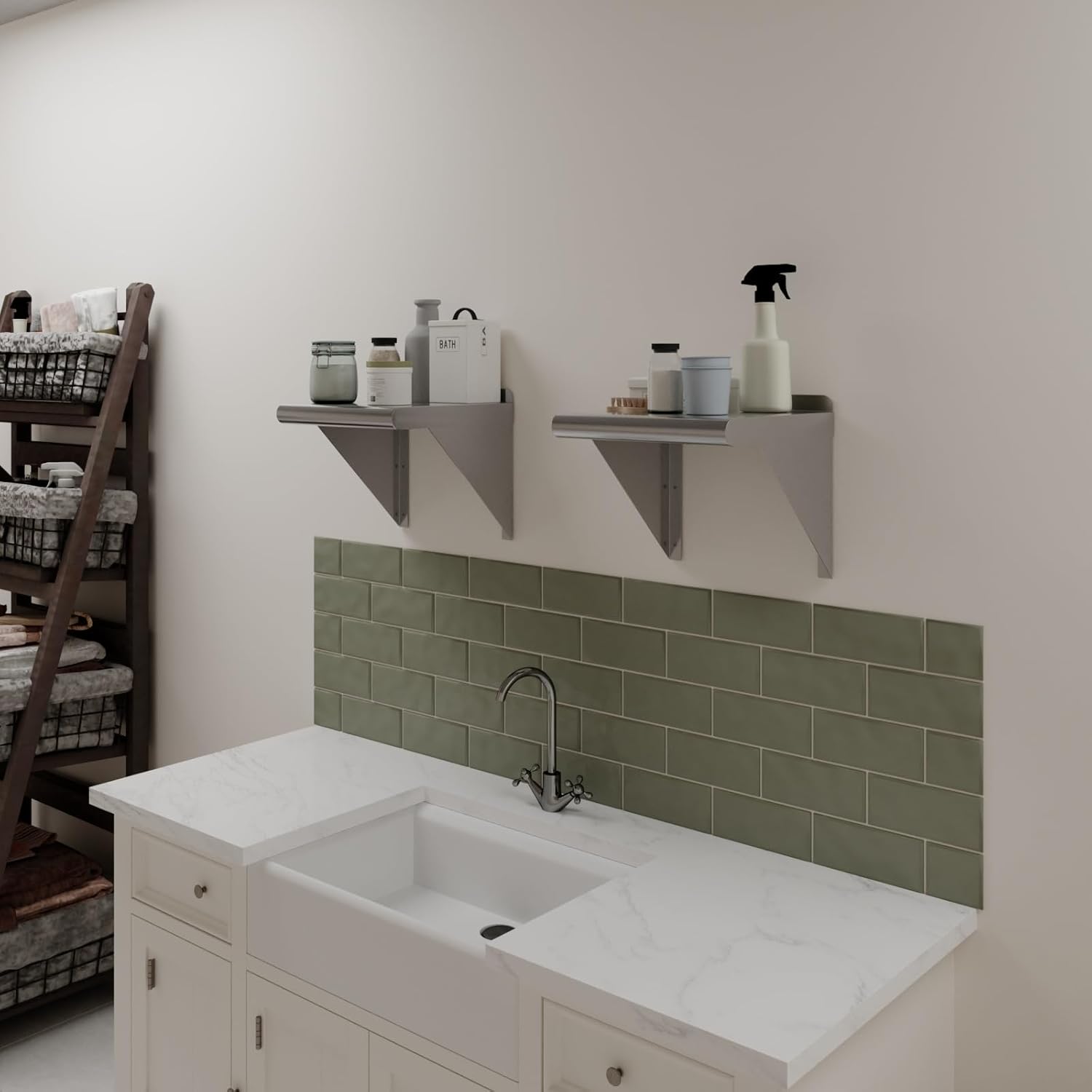 - This corrosion-resistant wall mount shelf can handle anything you throw at it and will last for years to come. Easy to clean and sterilize, metal shelves are superior to wood or glass. Food and liquid wonโt get stuck or ruin the integrity of the surface. Easily wipe away excess with no fuss, mess, or contamination.