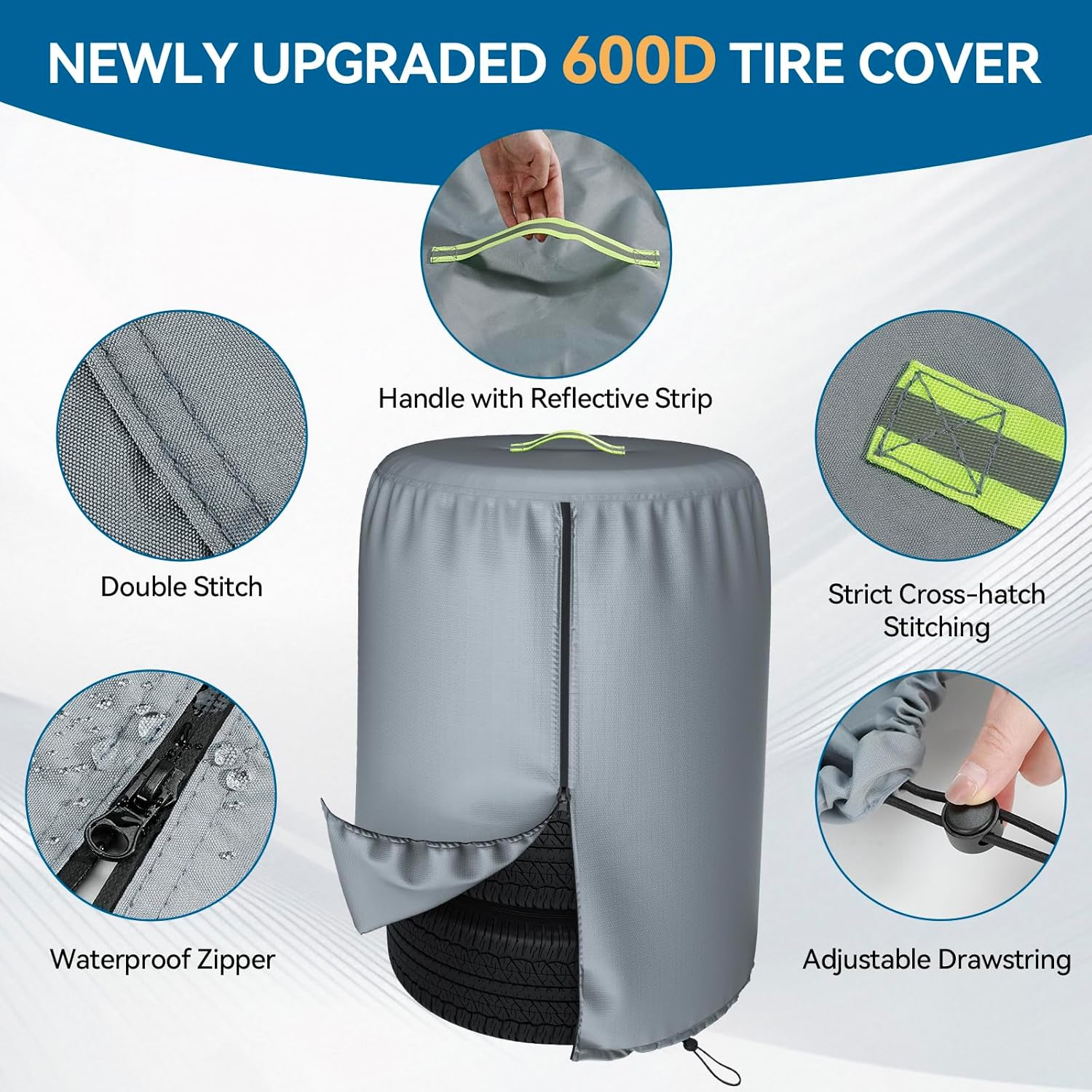 - šš¢š š” šš®šš„š¢šš² ššššš«š¢šš„&šššš« ššš¬š¢š¬ššš§š&šš®š«ššš„š: Made of Surface Waterproof Coating +UV coating+600D HEAVY DUTY Solution Dyed Polyester+ PA Backing, The higher the D value, the thicker the yarn and the thicker the fabric is! 600D is way heavier canvas than 420D /300D/210D; Well-crafted fabric protects your tires from scrapes and scratch damage. Our covers can withstand more tension and therefore have a longer service life than others.