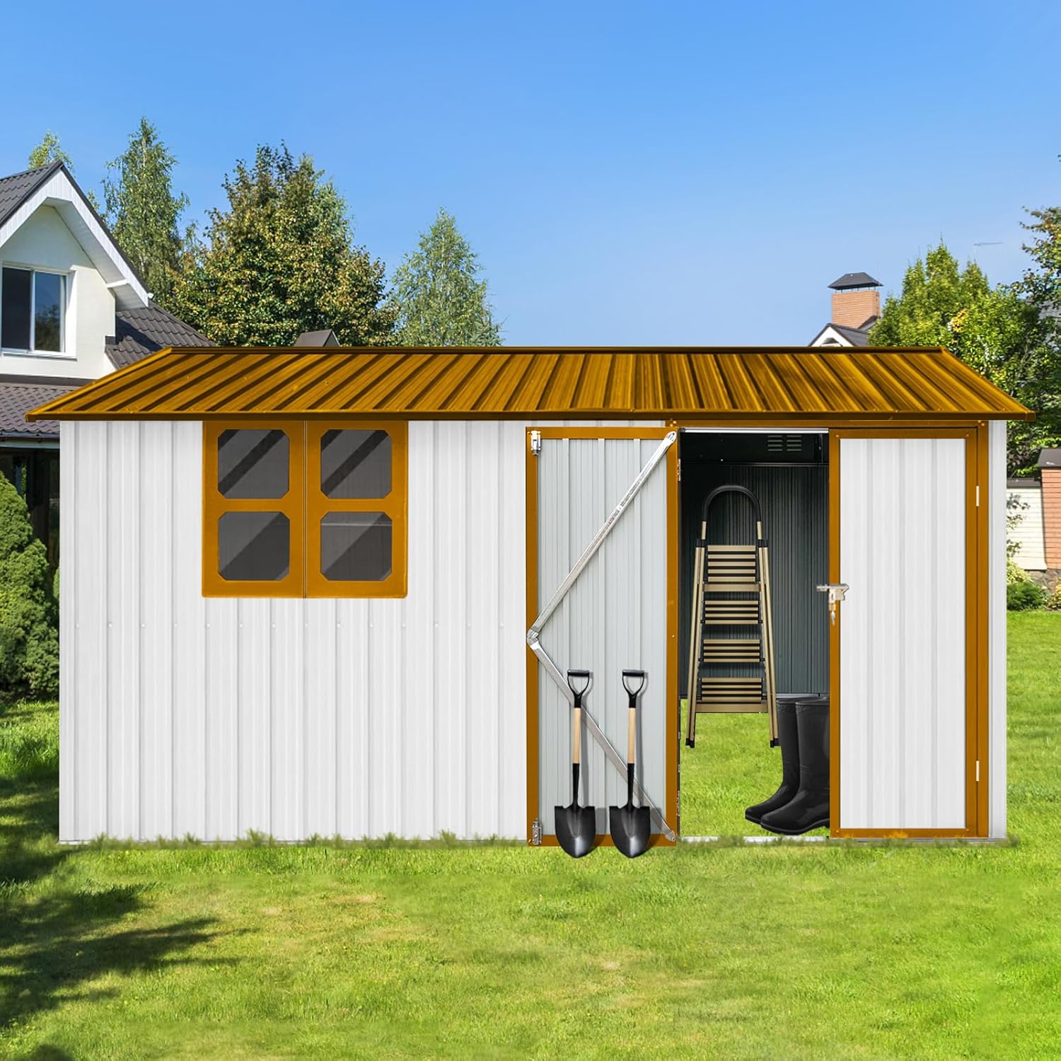 - š”šš§š¢šŖš®š ššØš«šš¢š ššš¬š¢š š§: This 10x12 shed features a sloped gable roof that adds extra storage space, easily accommodating snow shovels, bicycles, a BBQ grill, trash bins, and gardening tools. The large metal storage building is equipped with a four-pane transparent window, not only providing a soft and comfortable light inside but also bringing a touch of fresh Nordic charm with its rustic, country-style design.
