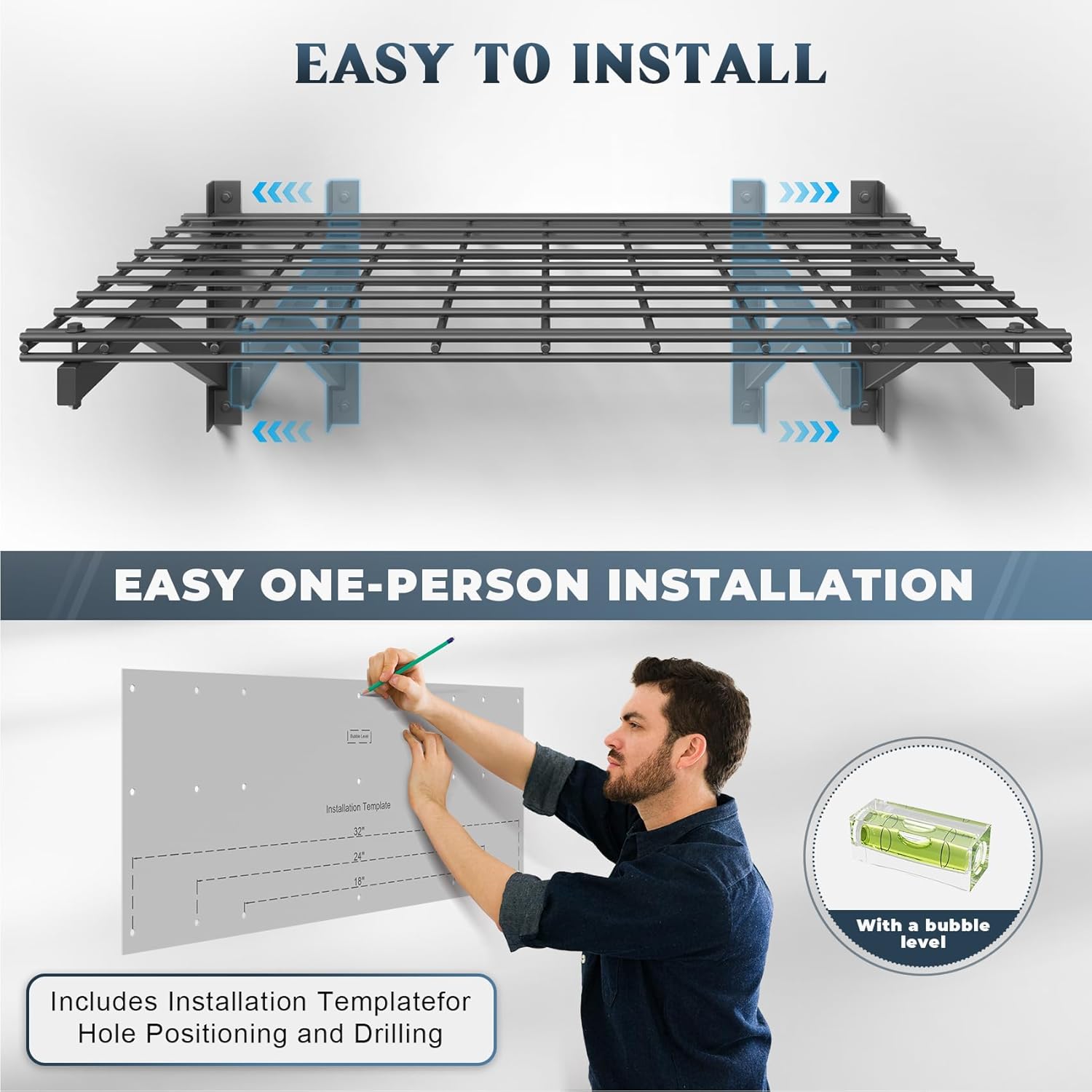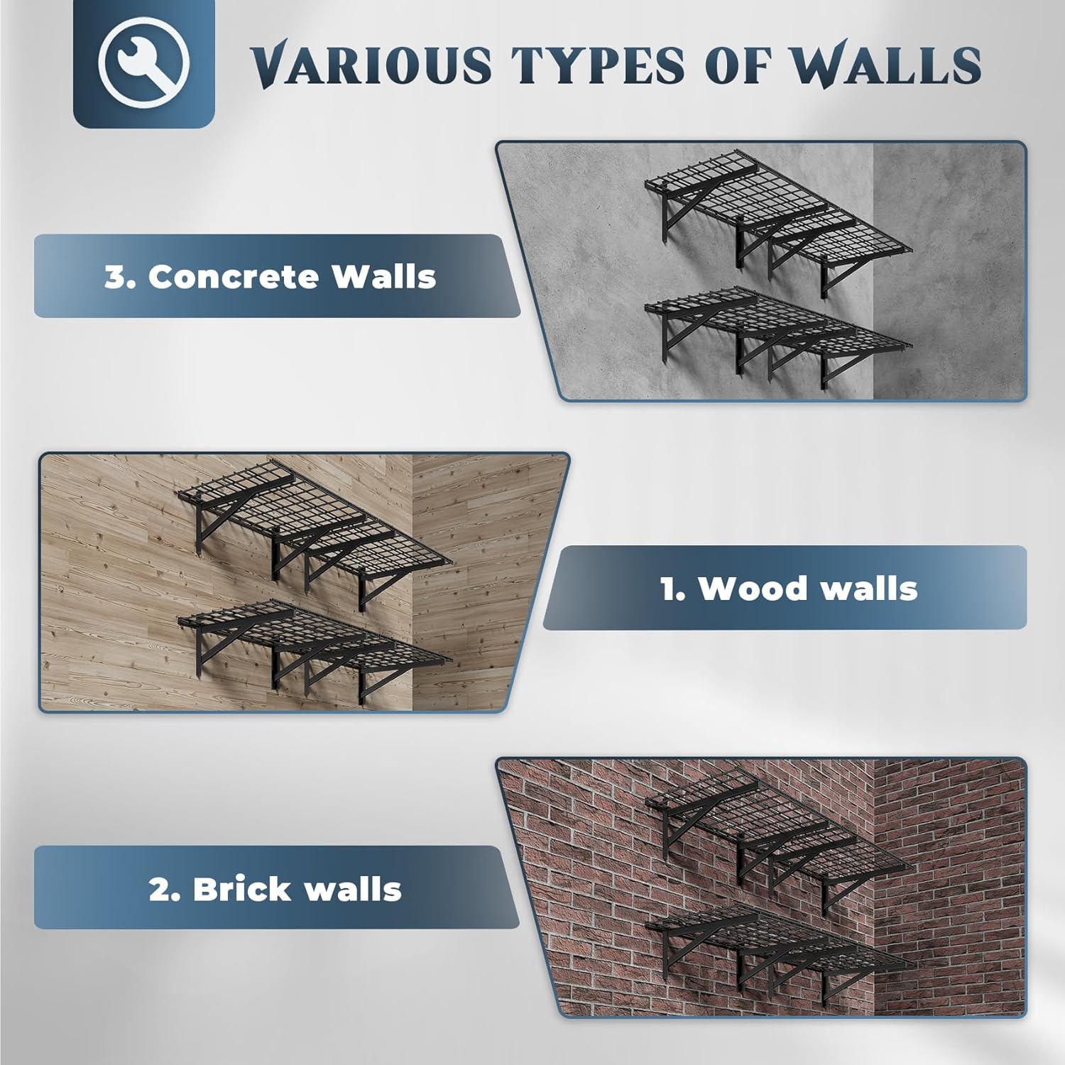 - đ§ăEffortless Modular Installationă- No drilling expertise required! Simply align the template, secure the brackets, and snap the grids into place. Compatible with concrete, wood, and brick walls (note: not for metal walls). Transform your cluttered garage into an organized space in under 30 minutes!