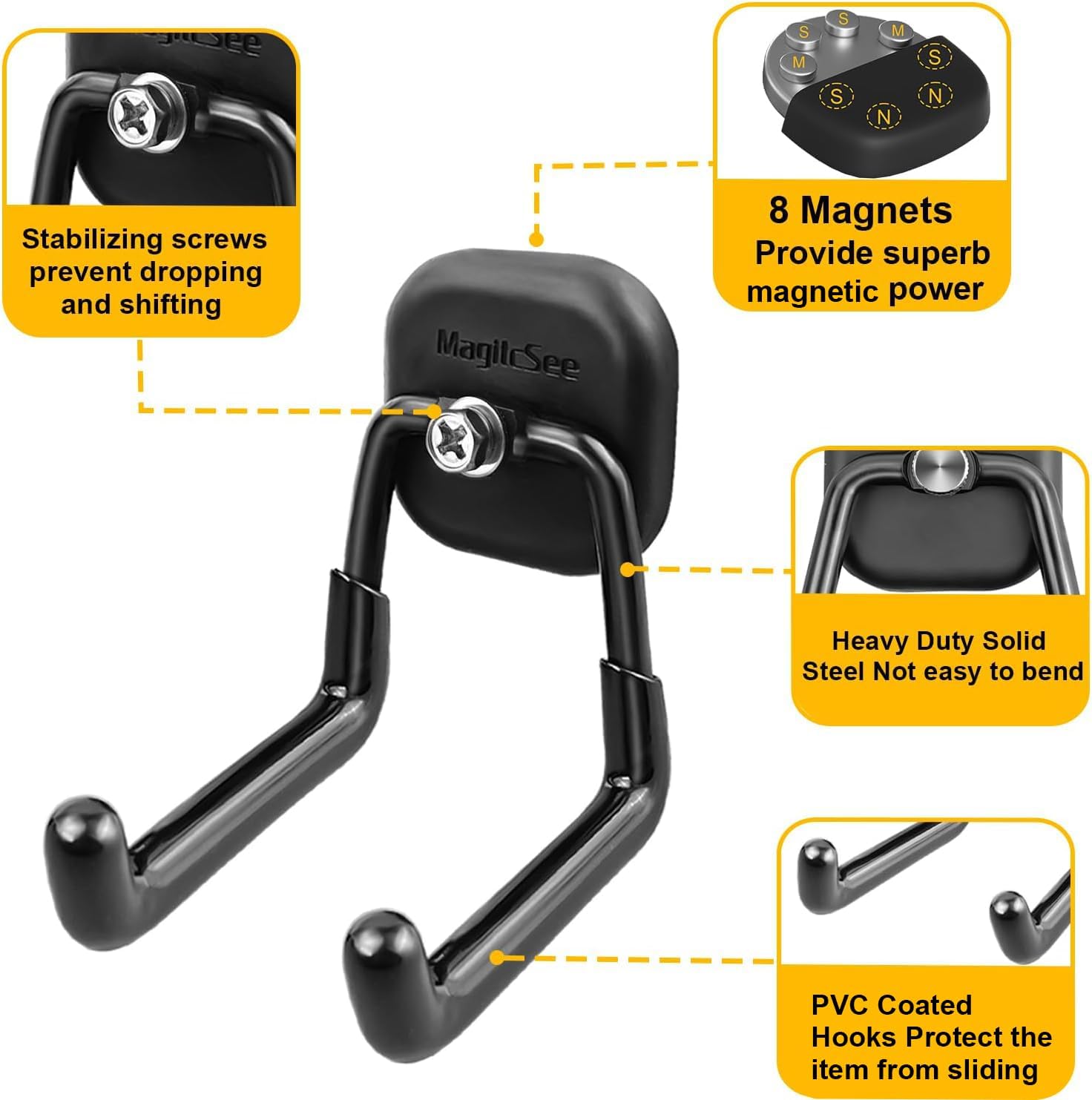 2 Pack Large Magnetic Garage Hooks Heavy Duty, Universal Indoor Outdoor Strong Storage Magnet Utility Tool Organizer Holder with Anti Slip Rubber Coating for Garden Tools,Hose,Cruise,RV,Workshop