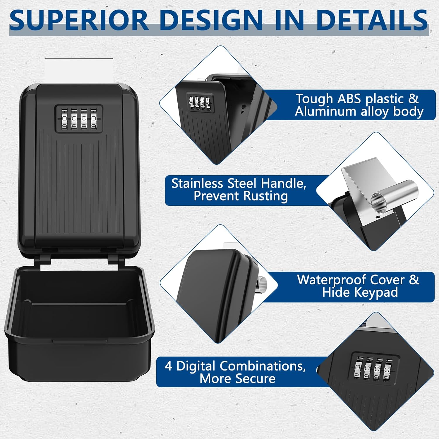 - Durable & Weatherproof Design: Our car window lock box is upgrated with sturdy solid aluminum alloy body and tough ABS plastic coating, durable and strong enough; the lock box is built with a protective cover to withstand harsh weather conditions, ensuring your keys stay safe and dry any weather conditions.