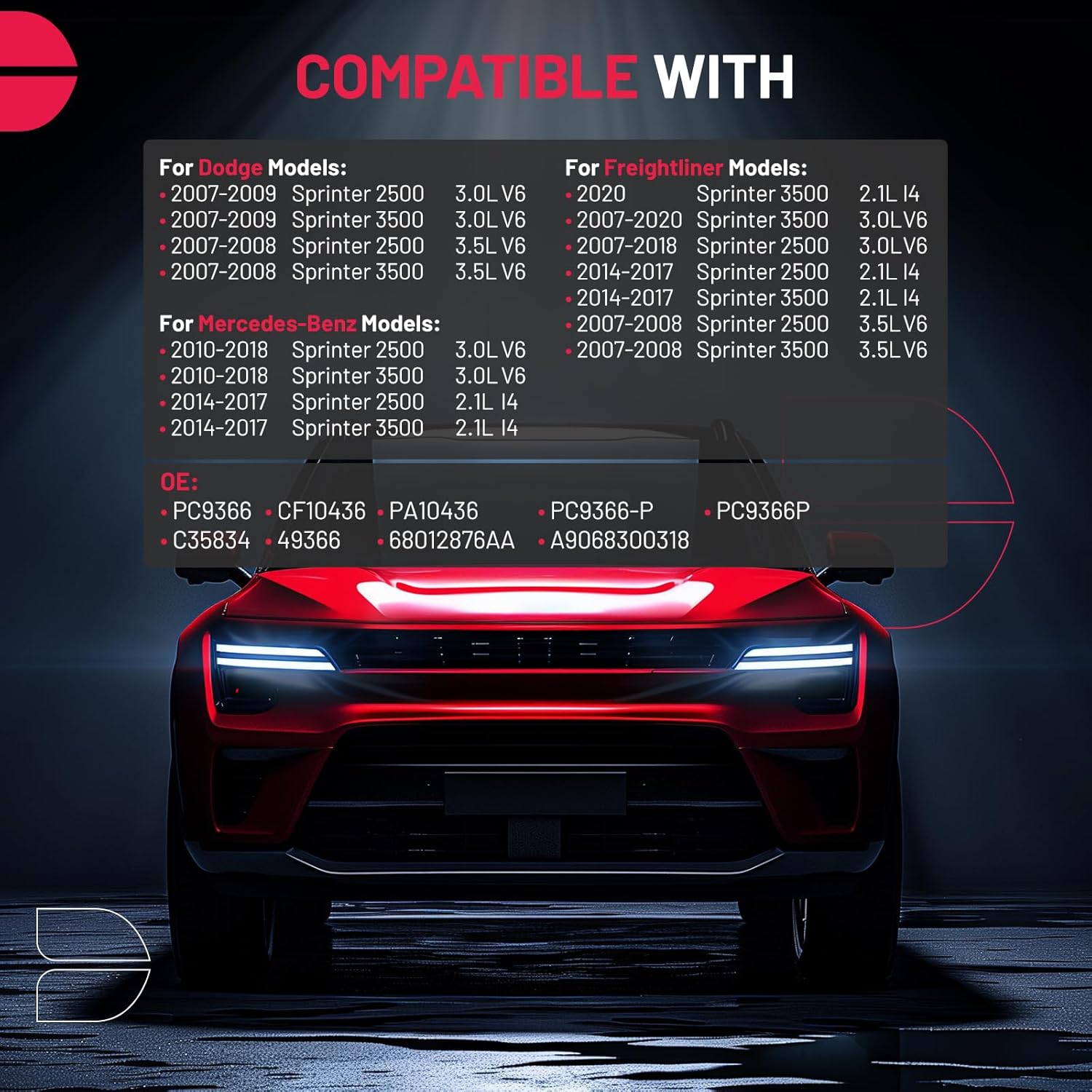 - [Vehicle Fitment] Compatible with Freightliner Sprinter 3500 2014-2017&2020 2.1L l4, Sprinter 3500 2007-2020 3.0L V6, Sprinter 3500 2007-2008 3.5L V6, Sprinter 2500 2014-2017 2.1L l4, Sprinter 2500 2007-2018 3.0L V6, Sprinter 2500 2007-2008 3.5L V6; Compatible with Mercedes-Benz Sprinter 2500/3500 2010-2018 3.0L V6, Sprinter 2500/3500 2014-2017 2.1L l4; Compatible with Dodge Sprinter 2500/3500 2007-2009 3.0L V6, Sprinter 2500/3500 2007-2008 3.5L V6