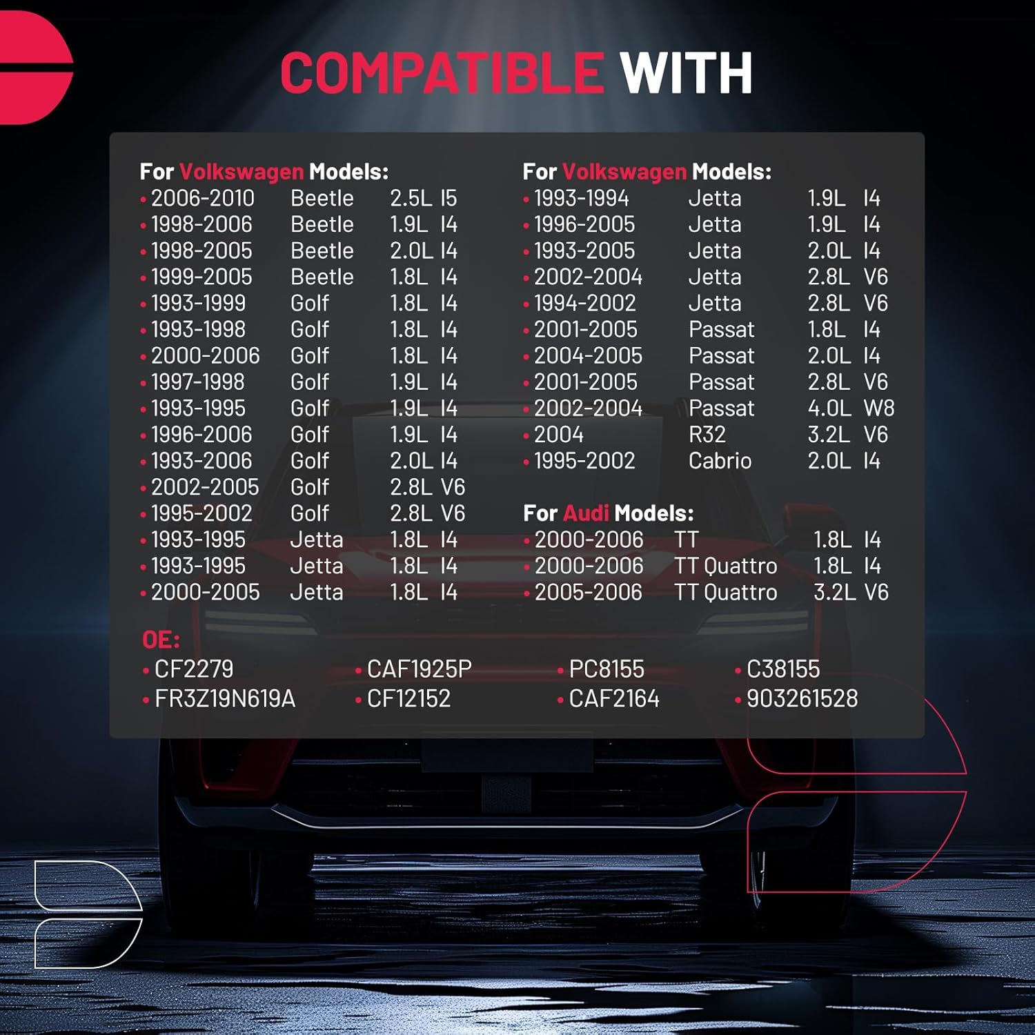 - [Vehicle Fitment] Compatible with Volkswagen Beetle 1998-2010, Golf 1993-2006, Jetta 1993-2005, Passat 2001-2005, R32 2004, Cabrio 1995-2002; Compatible with Audi TT/TT Quattro 2000-2006