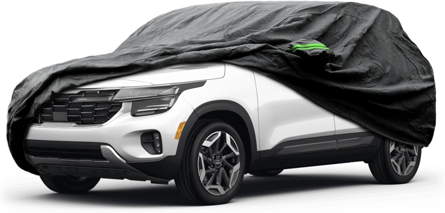 - Safe & Convenient: Durable car cover for Kia Seltos increases safety for nighttime street parking with reflective warnings on the front and rear. The full exterior covers easily can be put on and put off with one person, very lightweight! Attached FREE storage bag for easy carry-around and long-term storage