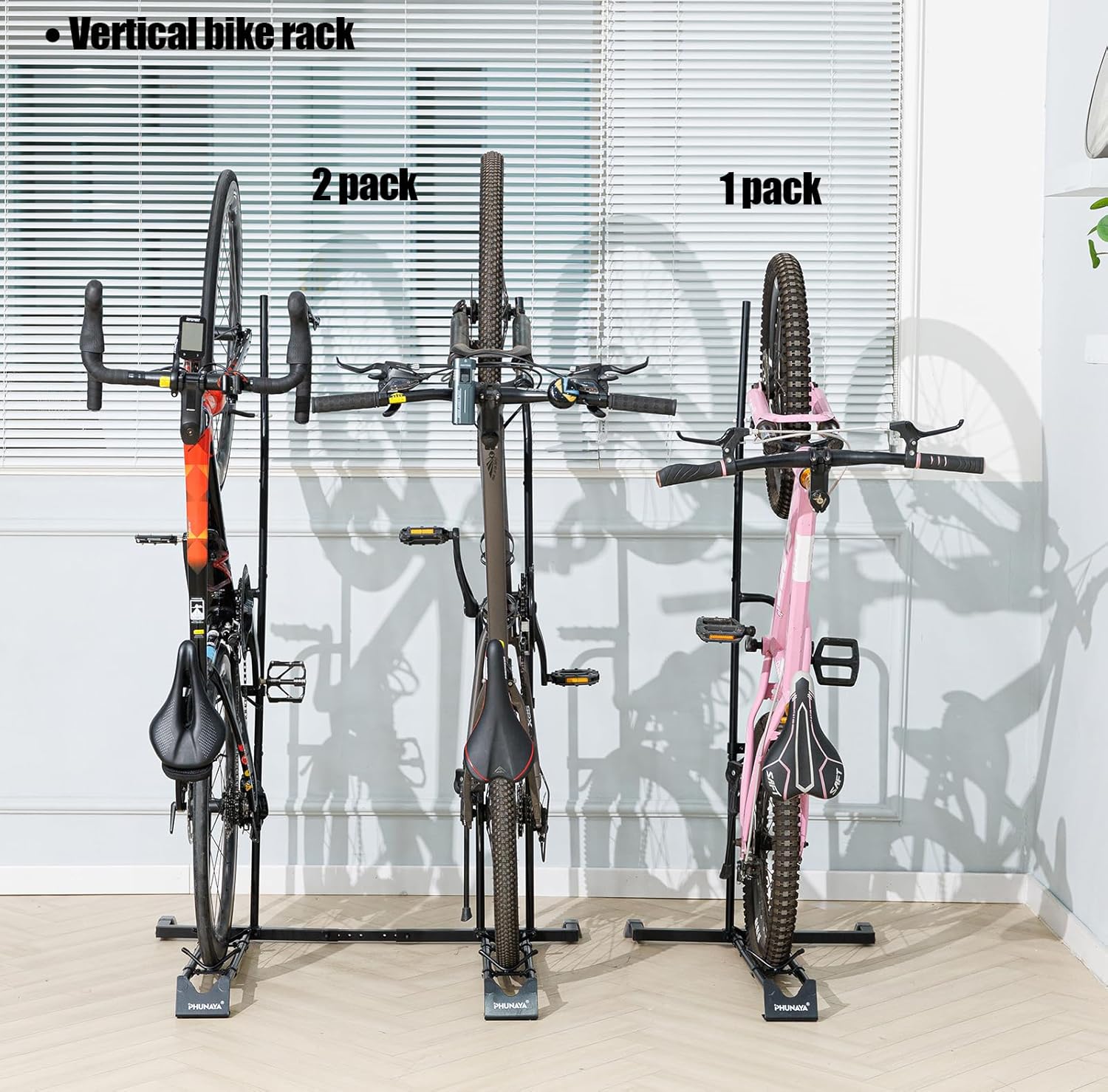 - 【Space saving】The PHUNAYA vertical bike stand is a great space saver,you can hold your bike vertical at garage corner,apartment and office.The upright bike stand also can be horizontal bike storage,it supports holding bike horizontal free on the floor.