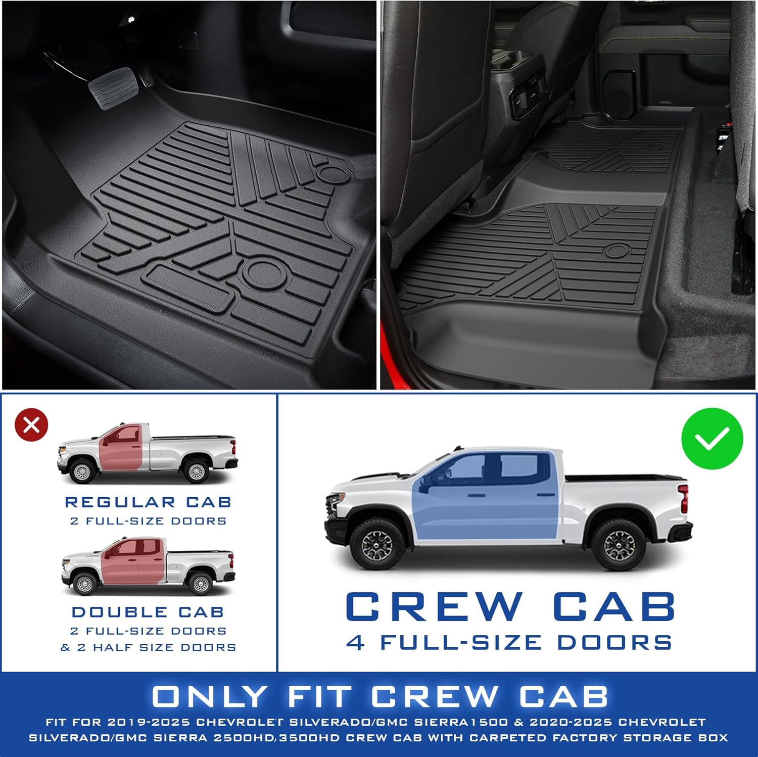 - Material Thermoplastic Elastomer (TPE) : Vehicle Service Type Fits for 2019-2025 Chevrolet Silverado 1500/GMC Sierra 1500 & 2020-2025 Chevrolet Silverado/GMC Sierra 2500HD/3500HD Crew Cab Fits for 2019-2025 Chevrolet Silverado 1500/GMC Sierra 1500 & 2020-2025 Chevrolet Silverado/GMC Sierra 2500… See more