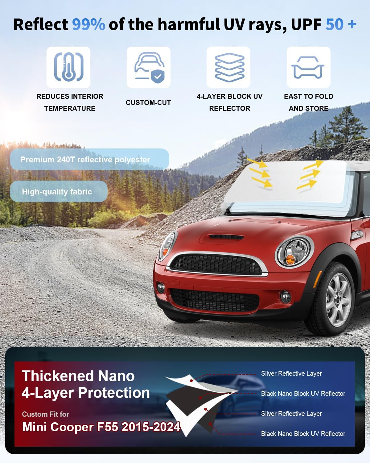 - [VEHICLE SPECIFIC] SLOGENTO Windshield Shade custom fit for 2015-2023 2024 2025 BMW Mini Cooper F55 Accessories ,Full covered your windshield,No Gap,100% Perfect fit.
