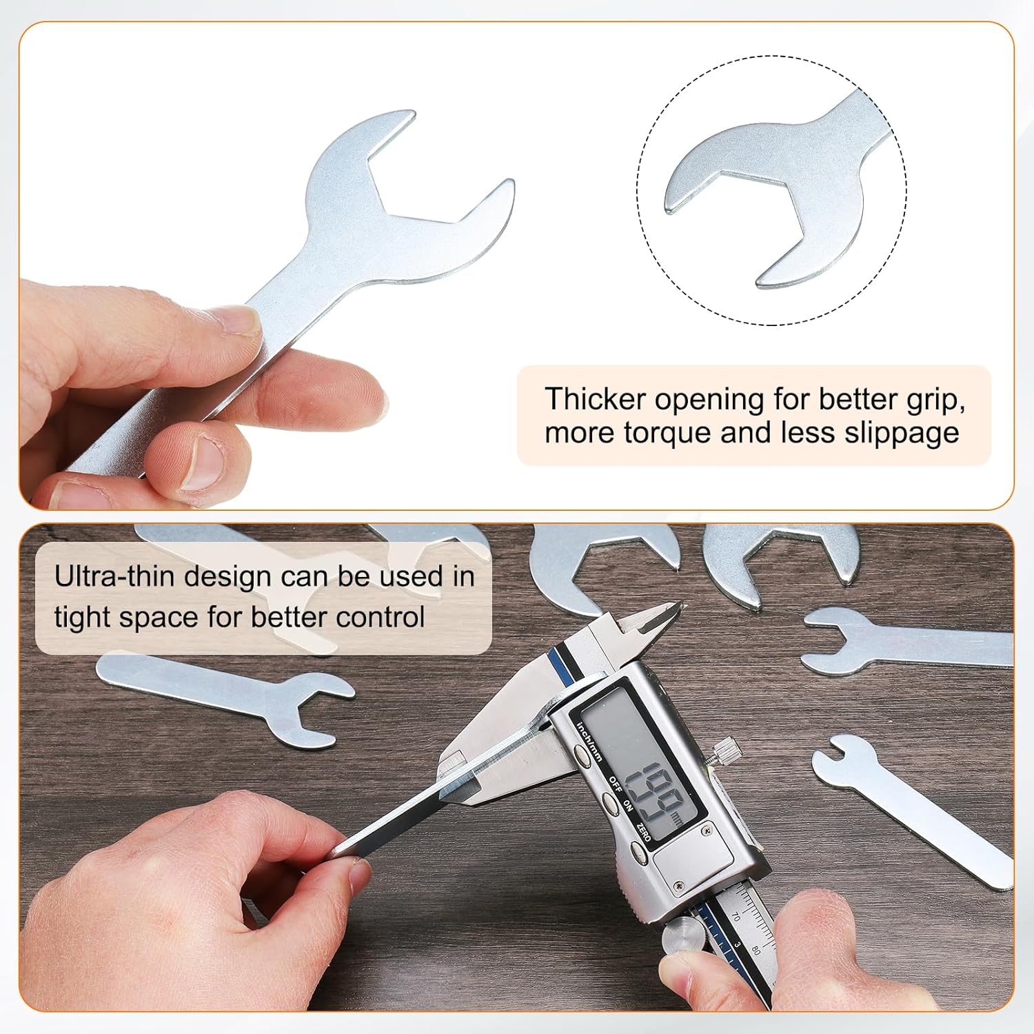 • Size - Open end: 24mm / 0.95"; Open outside width: 40.5mm / 1.59"; Total length: 115mm / 4.53"; Stem thickness: 2.8mm / 0.11"; Stem width: 12.3mm / 0.48"; Color: Silver-grey; Package includes: 10 x Single open-end wrenches. The open wrench set is thin enough to work on tight spots.