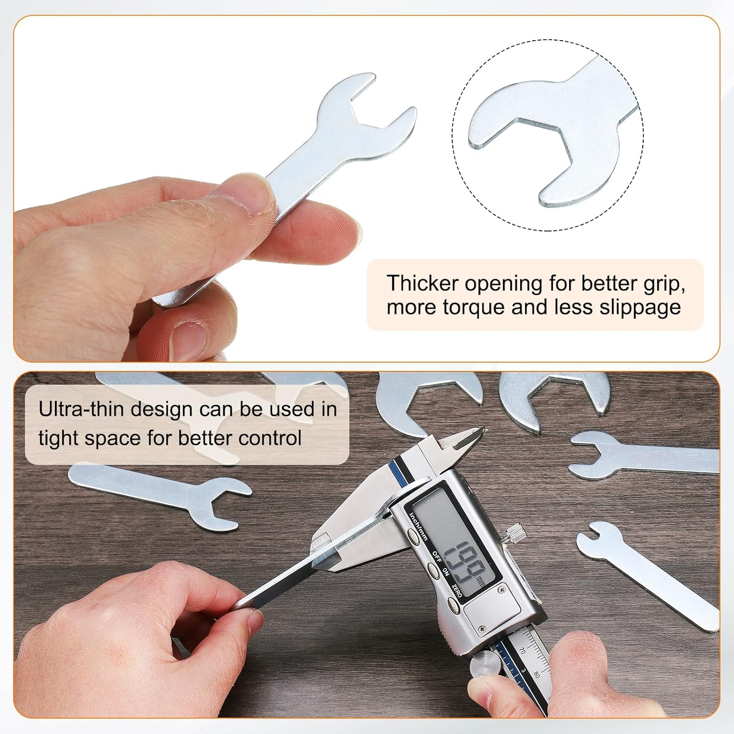 - Size - Open end: 12mm / 0.47"; Open outside width: 24mm / 0.95"; Total length: 70mm / 2.76"; Stem thickness: 1.5mm / 0.06"; Stem width: 11.3mm / 0.45"; Color: Silver-grey; Package includes: 10 x Single open-end wrenches. The open wrench set is thin enough to work on tight spots.