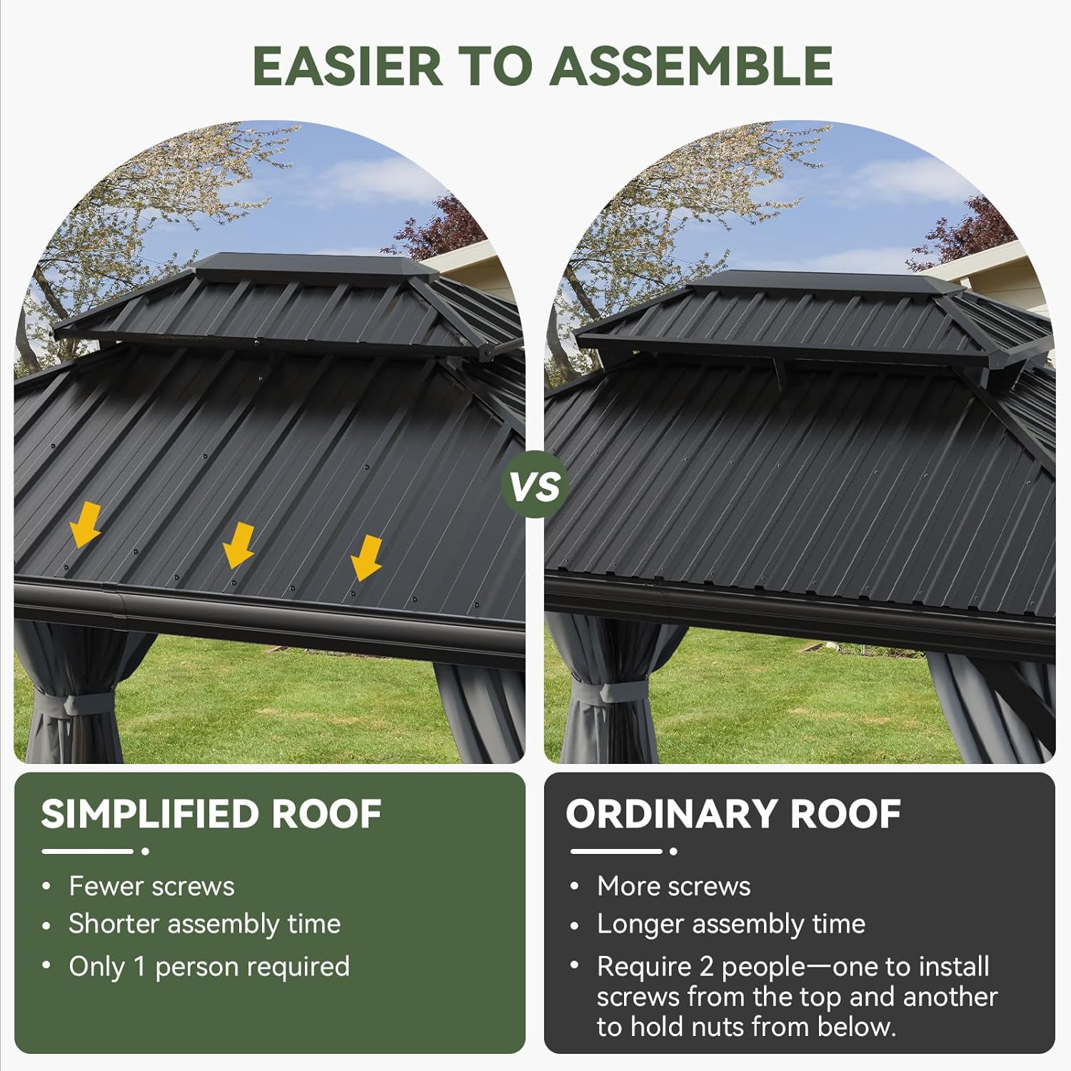 - Especially easy assemble: Our roof panel installation design allows for easy setup by just 1 person, who can secure the screws from the top. In contrast, other gazebos require 2 people—one to install screws from the top and another to hold nuts from below. Also, fewer screws are needed for our gazebo assembly, making it easier