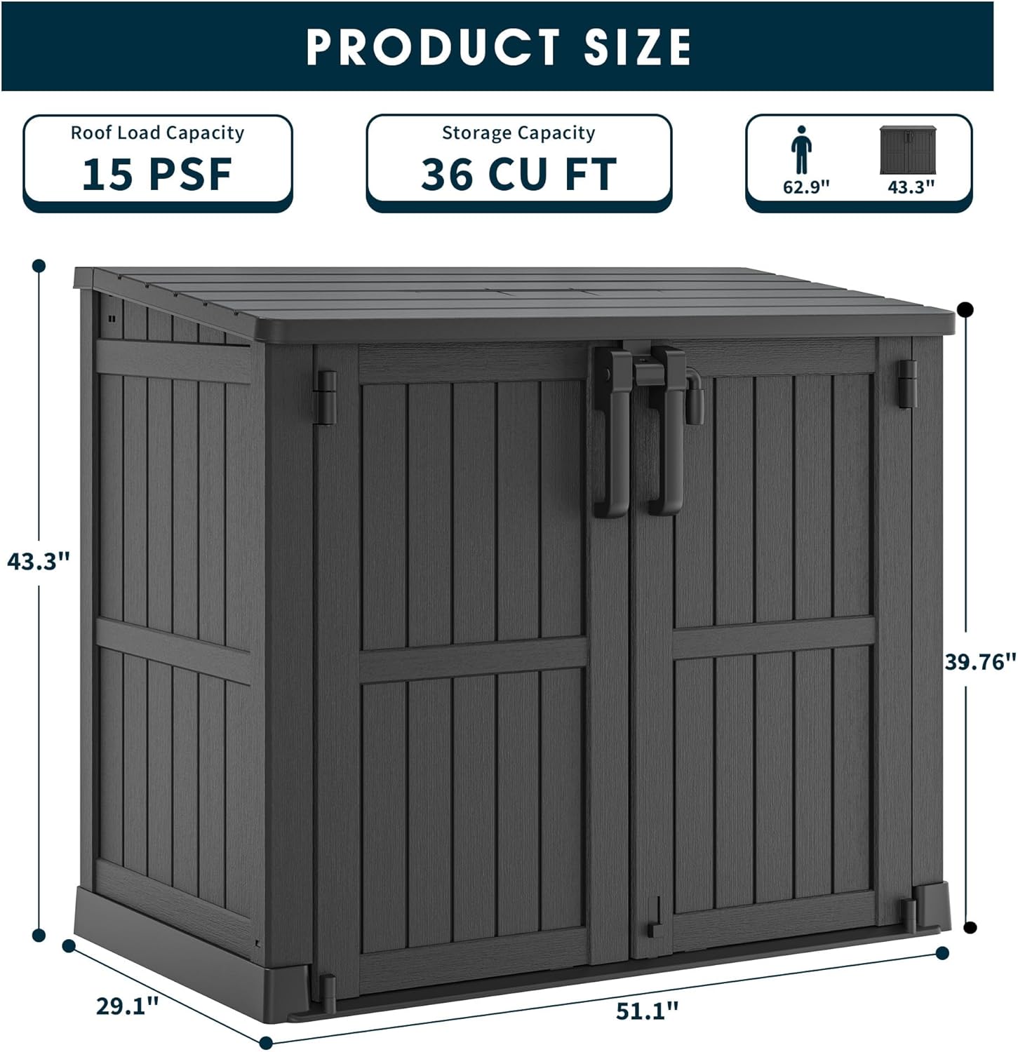- EXTRA LARGE STORAGE CAPACITY - Externally, this storage shed measures 50 inches long * 28.5 inches wide * 44 inches high, with a capacity of 34 cubic feet; perfect for storing gardening tools, small lawn mowers, bicycles, garden furniture and 2 small bins. You can add another laminate shelf (48x13 inches, sold separately), if you want to reduce clutter and save space, placing a storage shed in your yard, garden, backyard, living room or pool is a good choice.