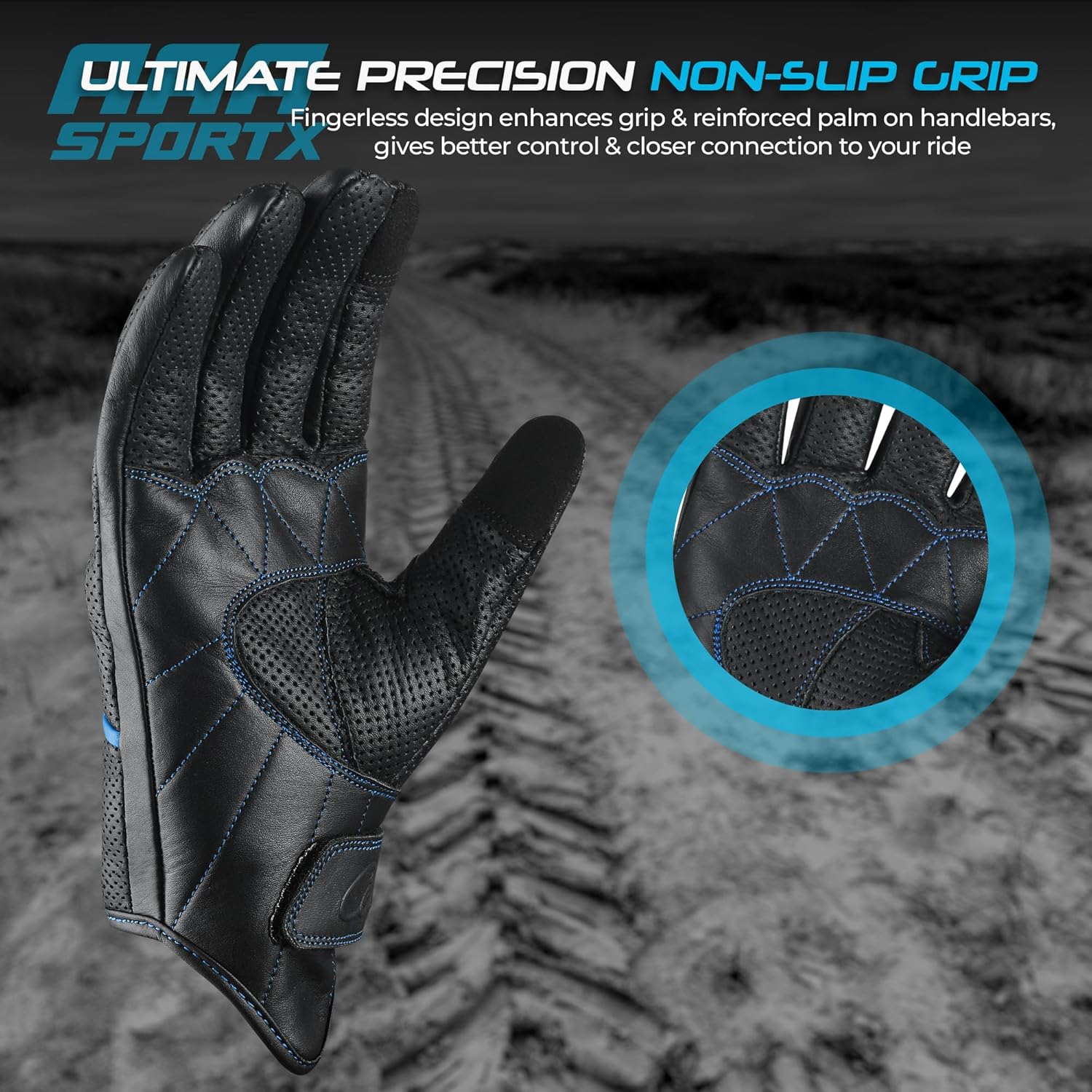 - LEATHER MOTORCYCLE GLOVES - aaasportx breathable black blue Motorcycle Gloves are made of Genuine perforated Leather. Our Lightweight Motorcycle Gloves ensures durability through a variety of situations. aaasportx Motorcycle Gloves for Men offer a high-quality, stylish, and durable finish that excludes sophistication and toughness on the road.