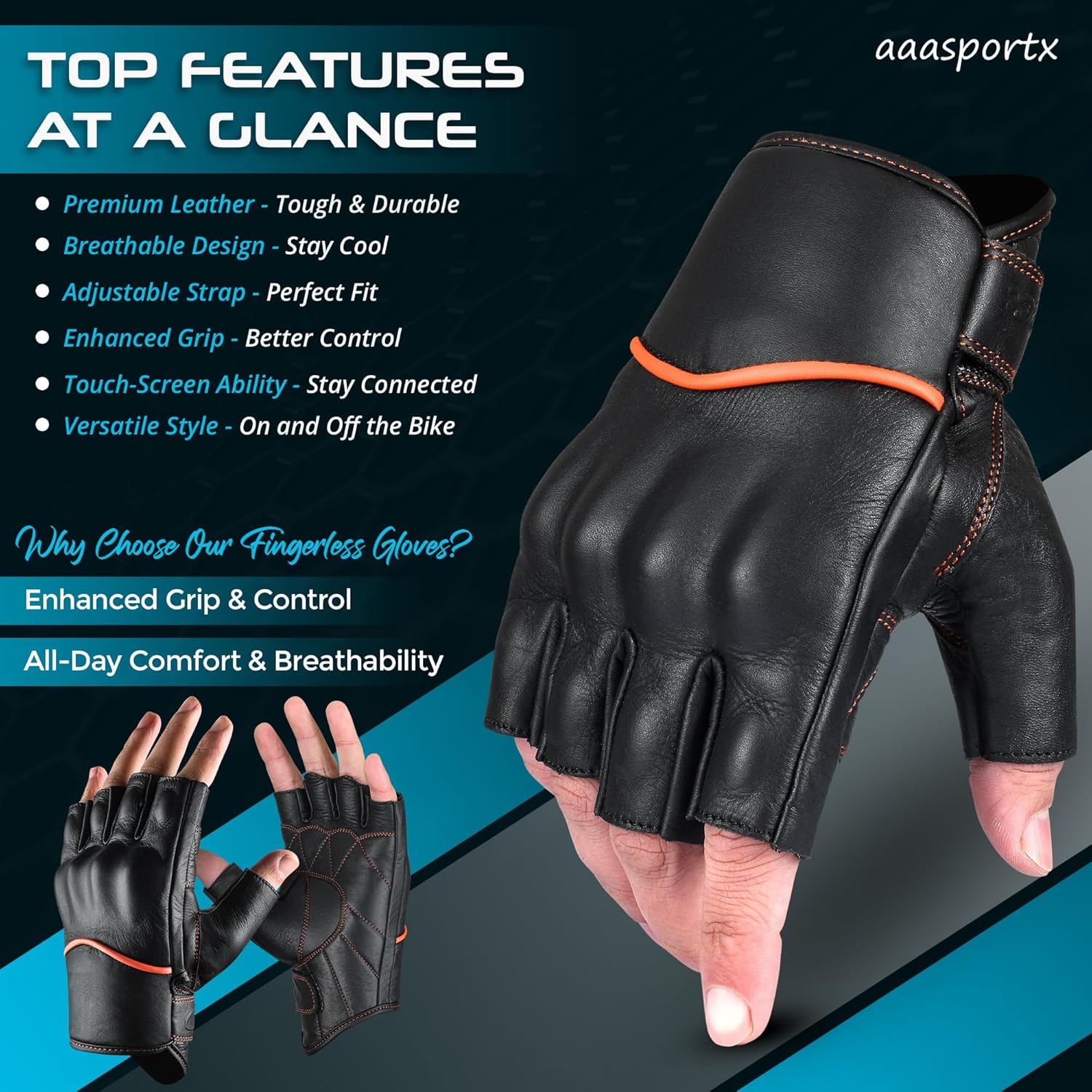 - LEATHER MOTORCYCLE GLOVES - aaasportx Best Motorcycle Gloves are made of Genuine Leather. Our Lightweight Motorcycle Gloves ensures durability through a variety of situations. aaasportx Motorcycle Gloves for Men offer a high-quality, stylish, and durable finish that excludes sophistication and toughness on the road.