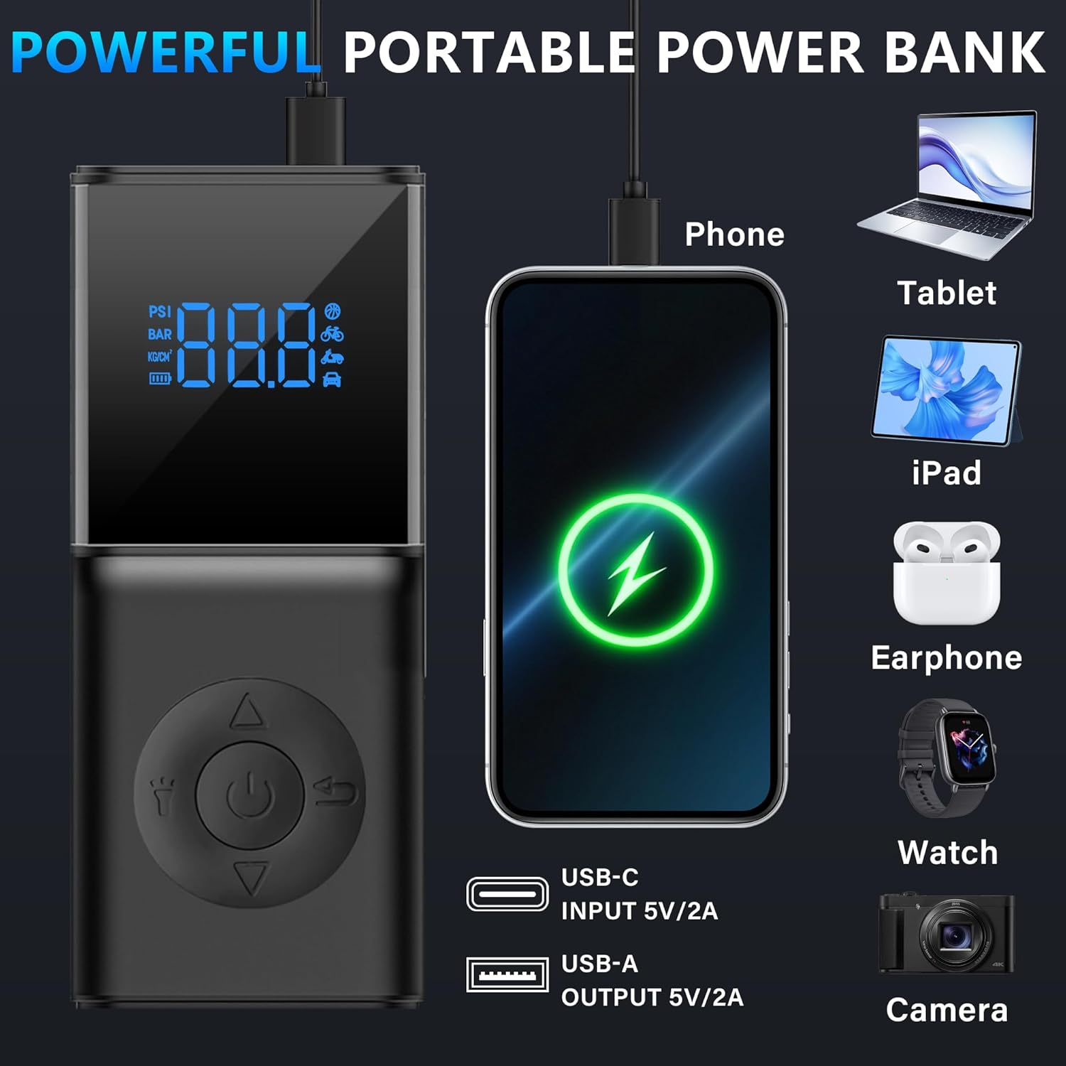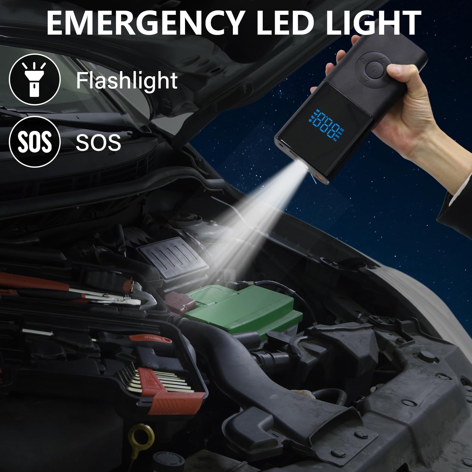 - 🔌【All-in-One Power Station】Portable jump starter with air compressor combines 4-IN-1 functions: car emergency start, tire inflation, power bank, and flashlight.It supports 4 optional units (PSI, BAR, KG/CM²) and 5 adjustment modes (Cars, Motorcycles, Bicycles, Basketball, Pressure Protection). With unique turbocharged capability of 35L/Min (150 PSI), it can quickly inflate a car tire to 20 PSI in just 2 minutes, and also will automatically stop when fully inflated.