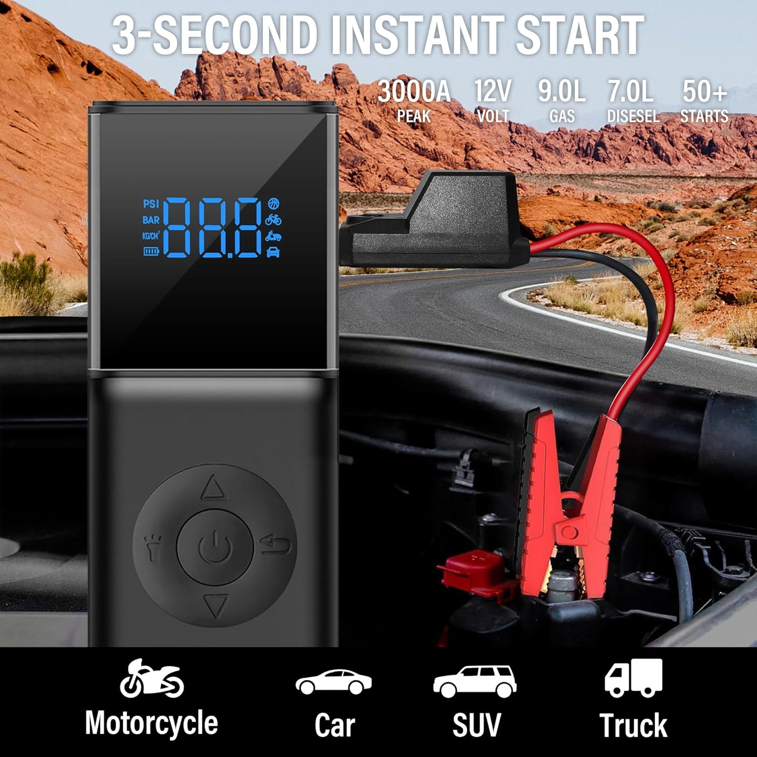 - ⚡【Powerful Jump Start】With 3000A peak current and high capacity, the car jump starter can start 9.0L gas and 7.0L diesel engines and 12V vehicles like cars, trucks, SUVs, motorcycly in 3 seconds. It works in extreme temperatures between -20°C to 60°C, even in snowstorms or deserts.