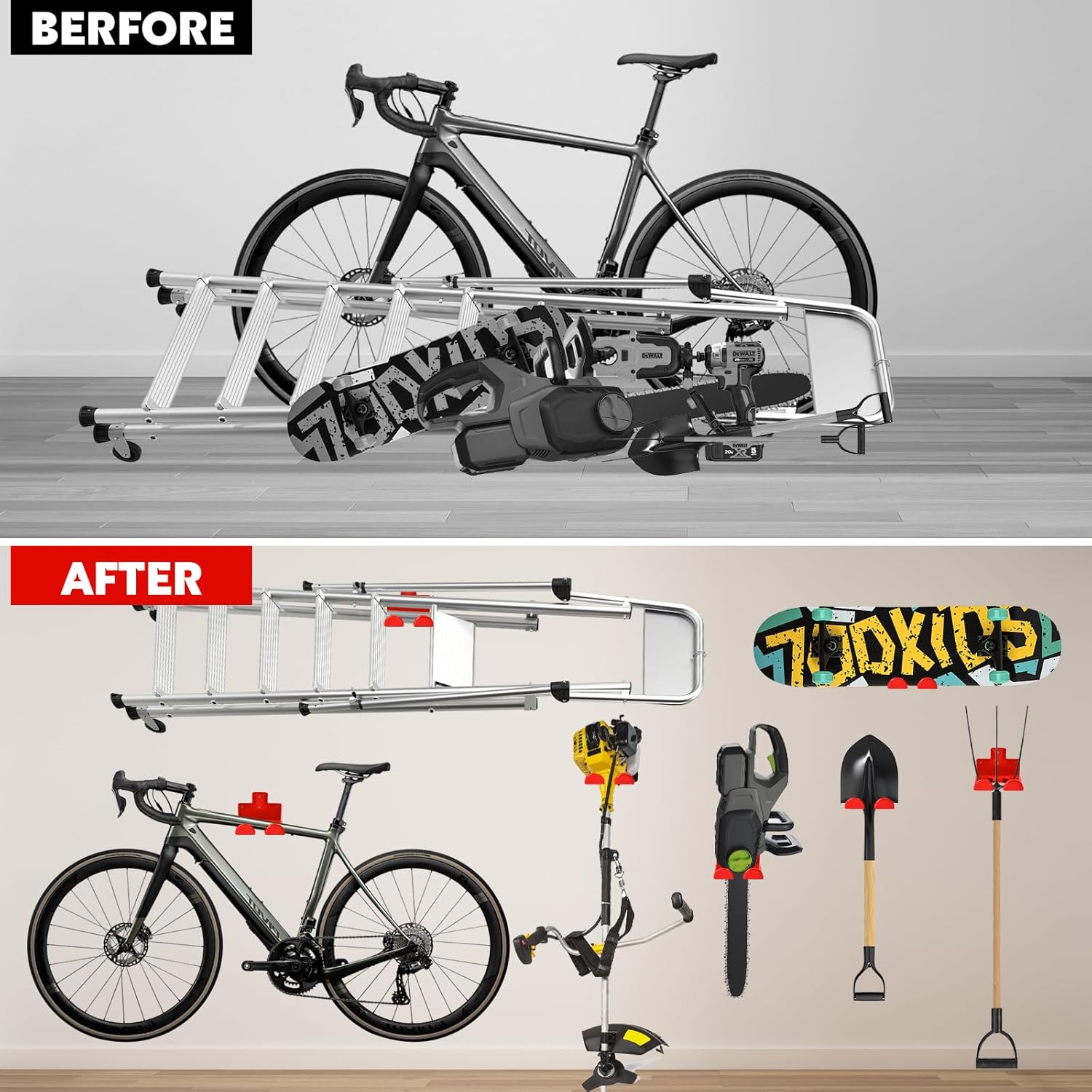 - Scratch Resistant Rubber Coating: Our trimmer rack is different from other simple paint coated tool hanger, it has thick rubber coating on the outside, smooth surfaces and edges are not only beautiful, waterproof and rust-proof, but also won't hurt your hands and tools