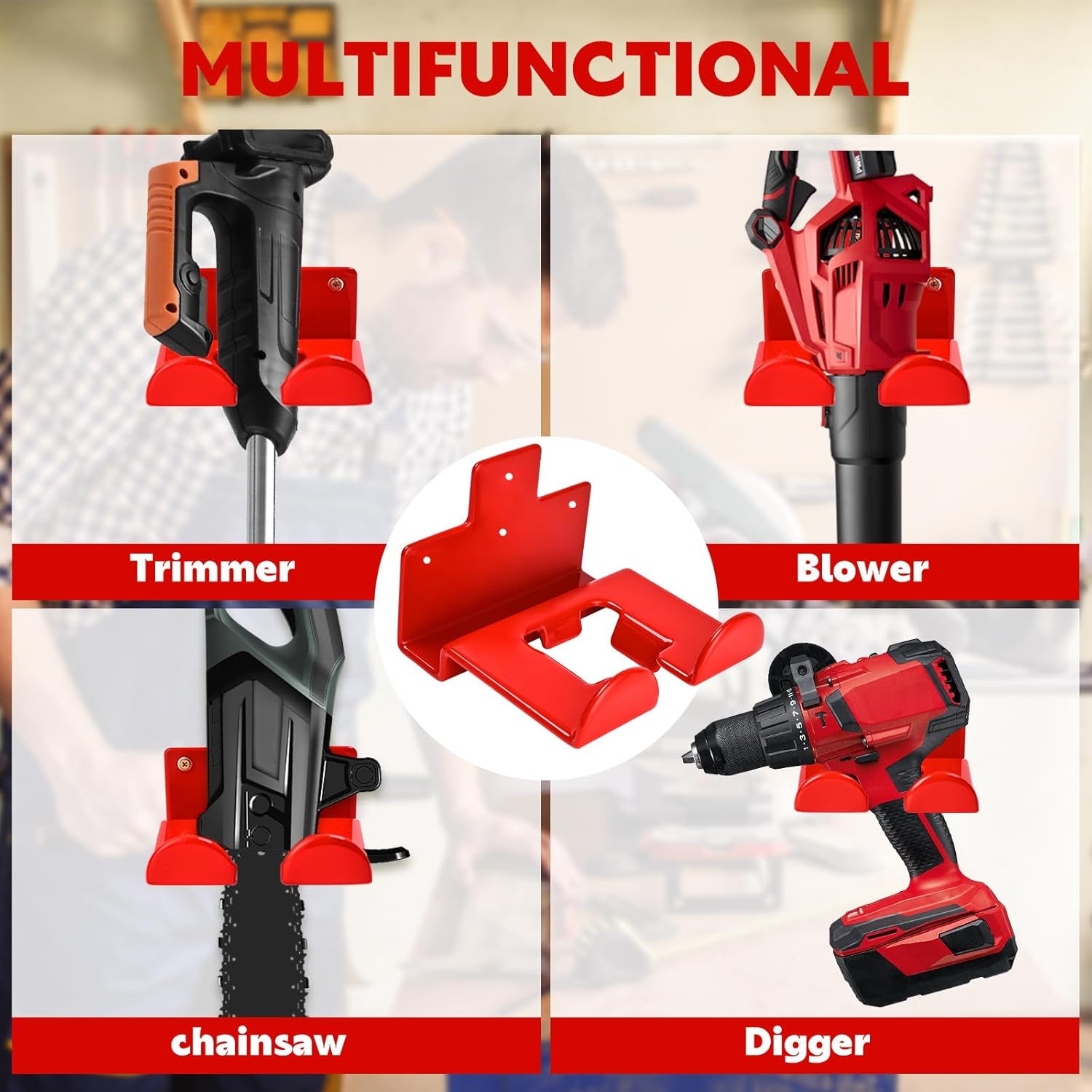 Garage Organization Weedeater Hanger Garage Organizer Trimmer Rack, Wall Mount Garden Tool Organizer Heavy Duty Tool Hangers for Hedge Trimmer, Chainsaw and Leaf Blower (1 Pack, Red)